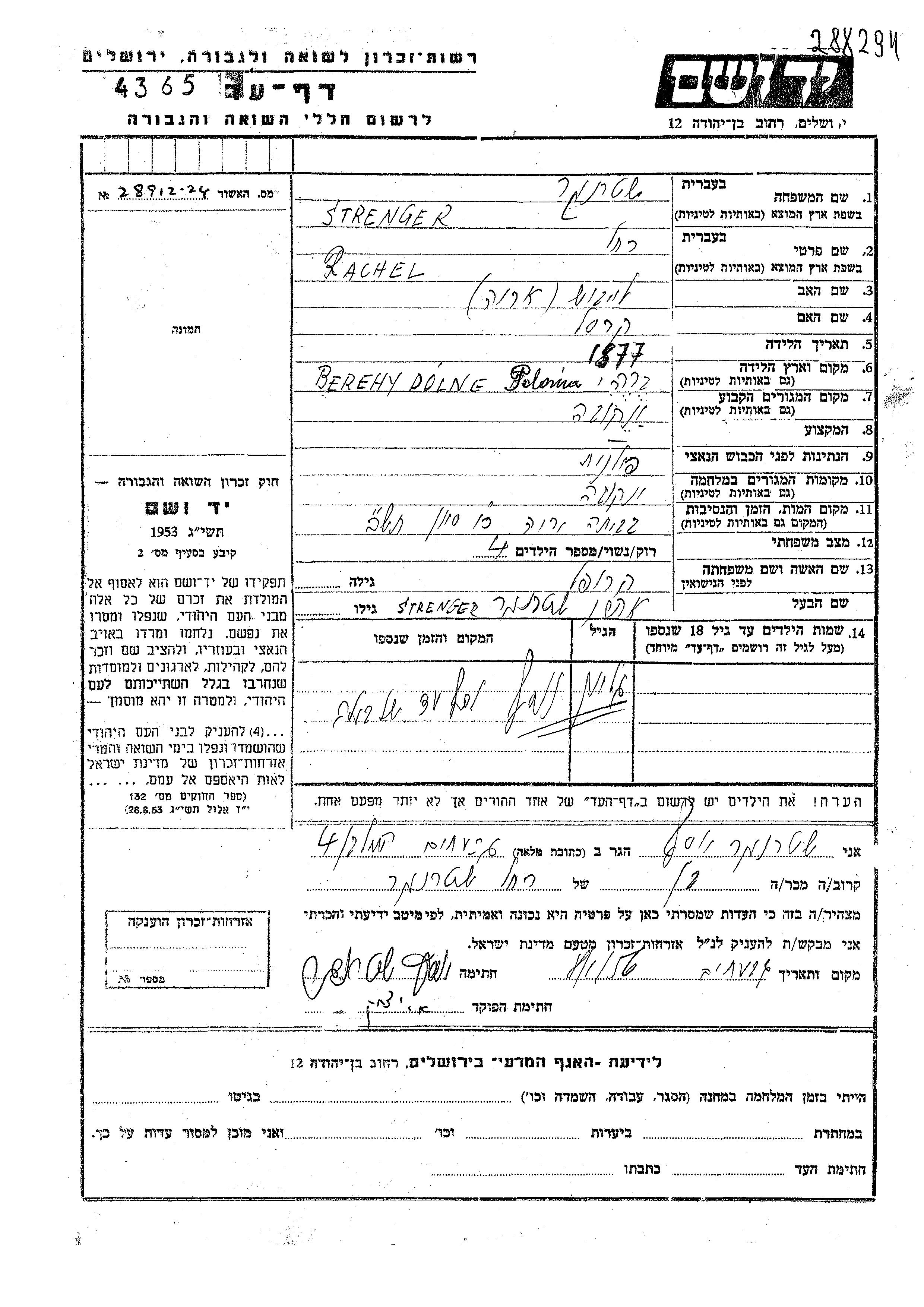 Strenger Rachel 1877 unstated place, Page of Testimony