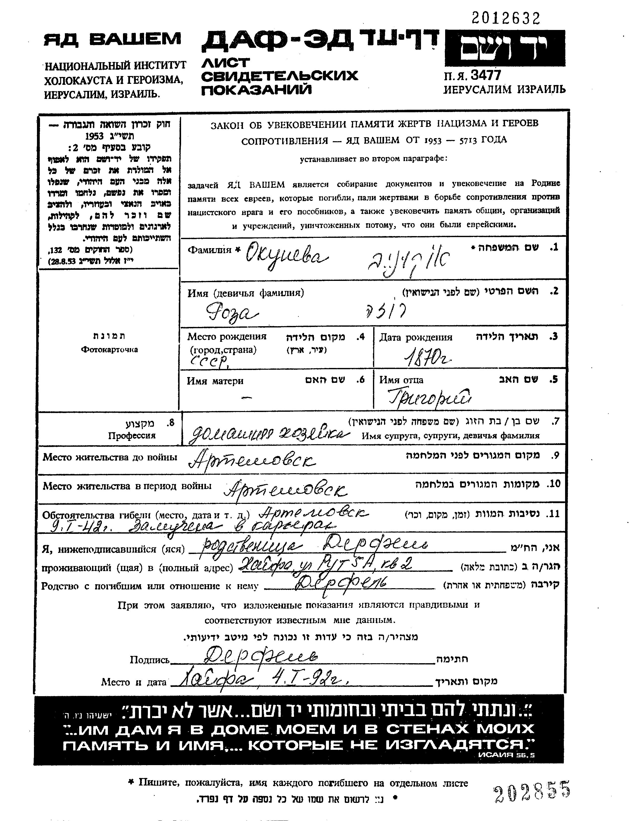 Okunev Roza 1870 Artemovsk, Ukraine (USSR) Page of Testimony