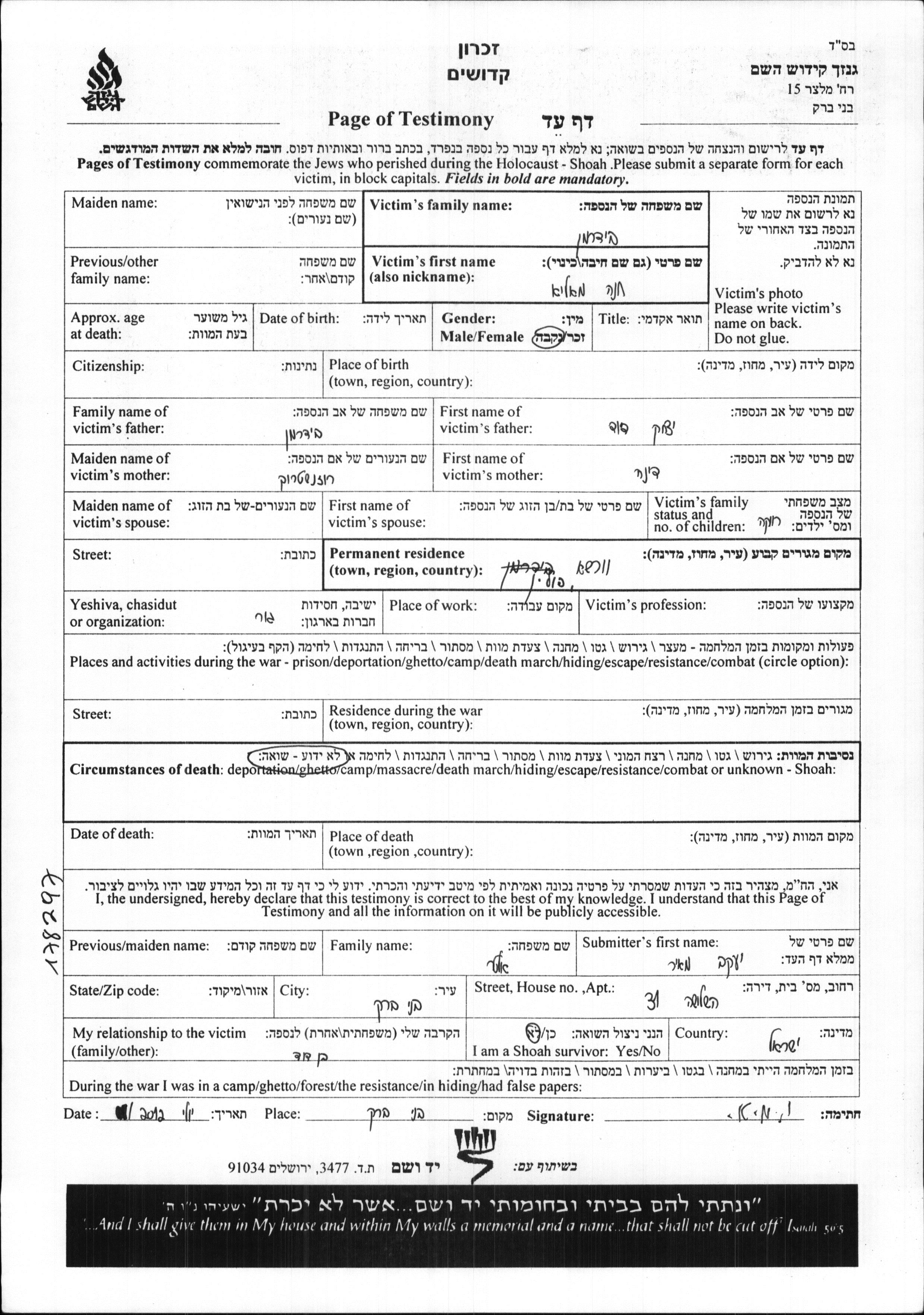 Yad Vashem - Pages of Testimony Names Memorial Collection