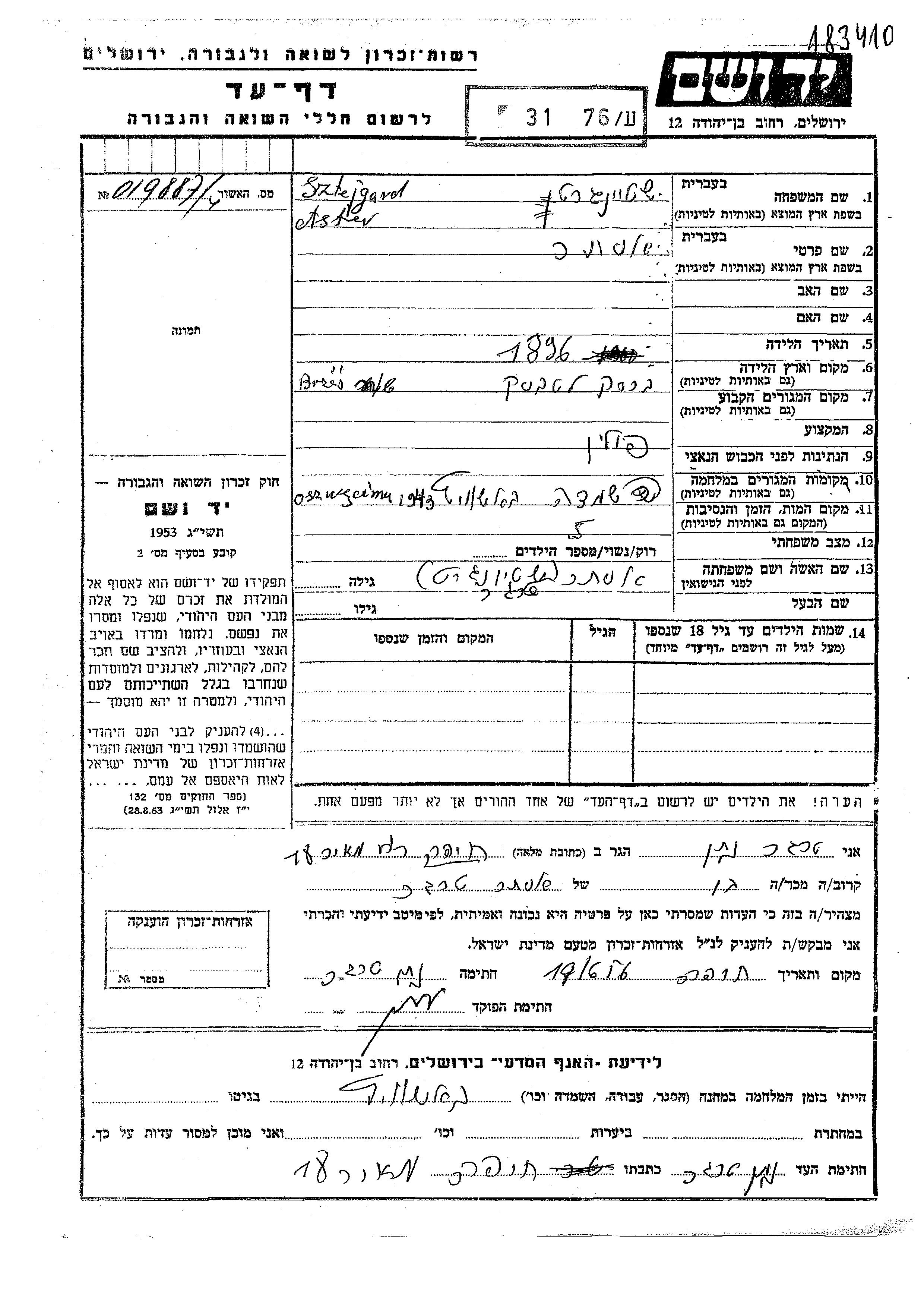 Yad Vashem - Pages of Testimony Names Memorial Collection