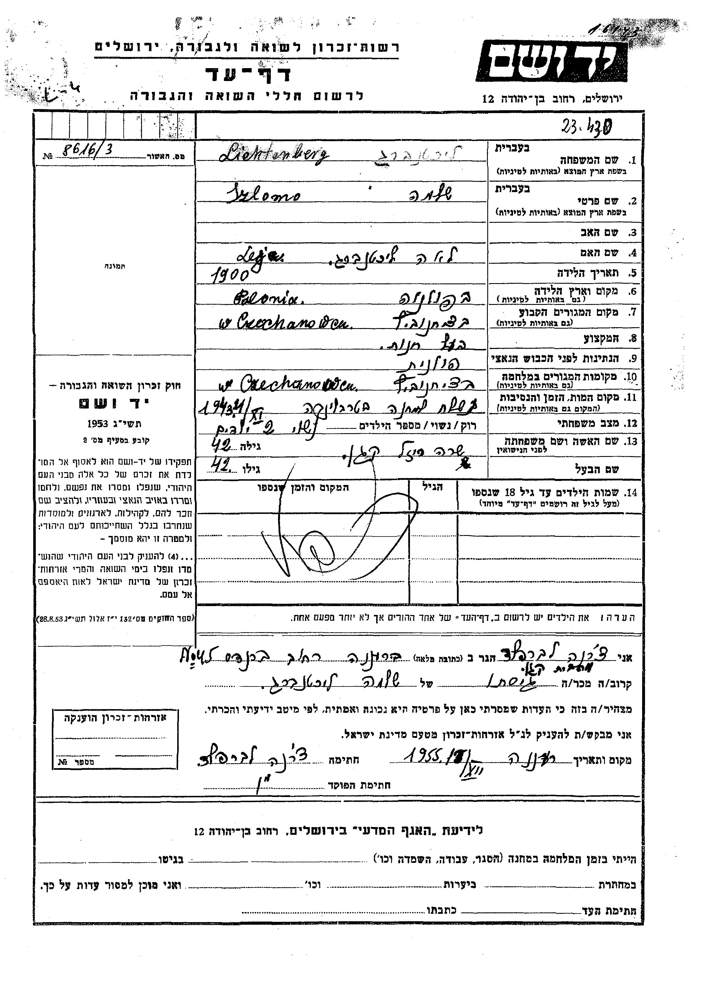 Lichtenberg Szlomo 1900 Czechanowice, Poland Page of Testimony