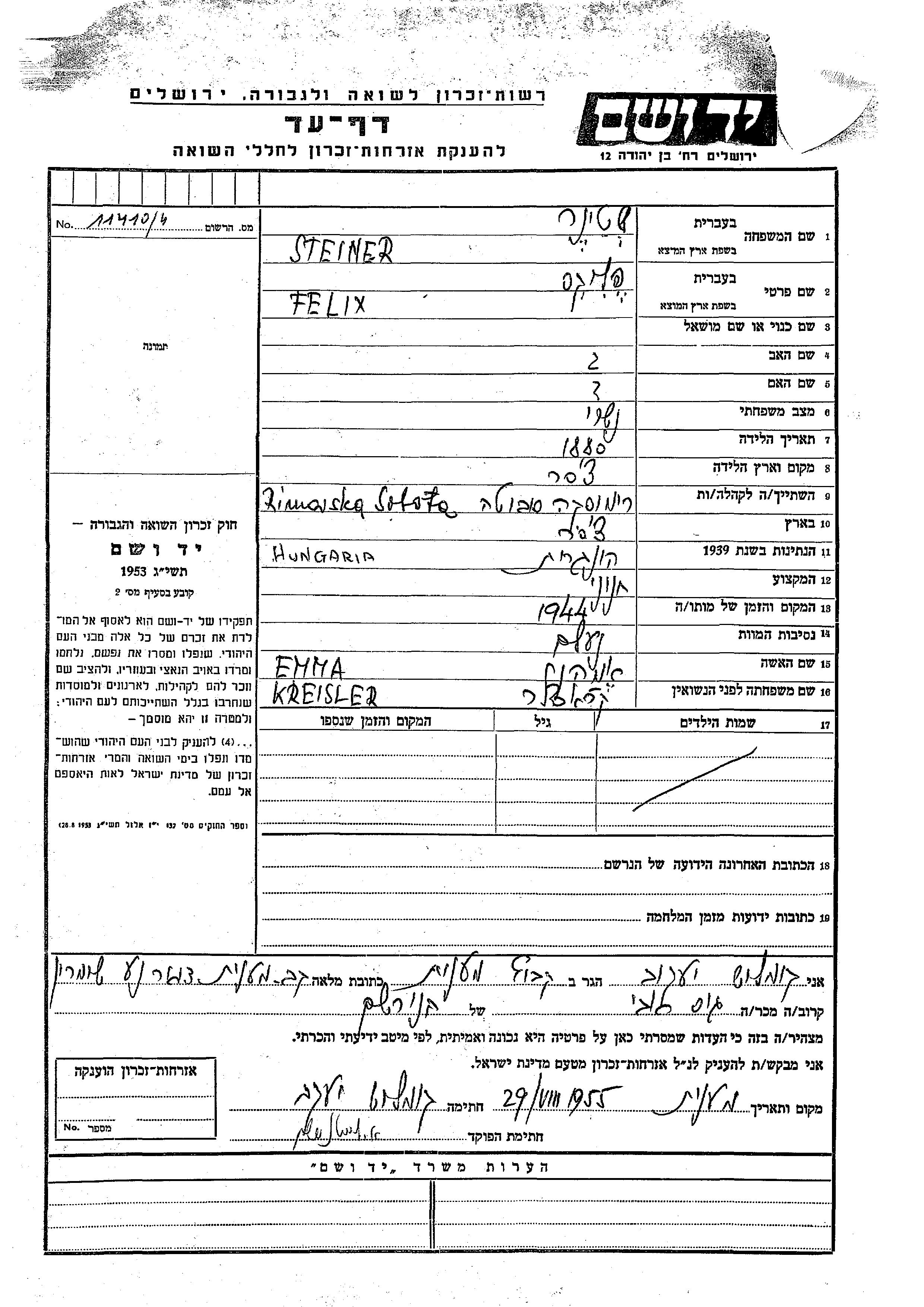 Felix Steiner was born in Czechoslovakia, 1880. He was a grocer and married to Emma nee Kreisler. Prior to WWII he lived in Rimavska Sobota, Czechoslovakia. During the war he was in Hungary.