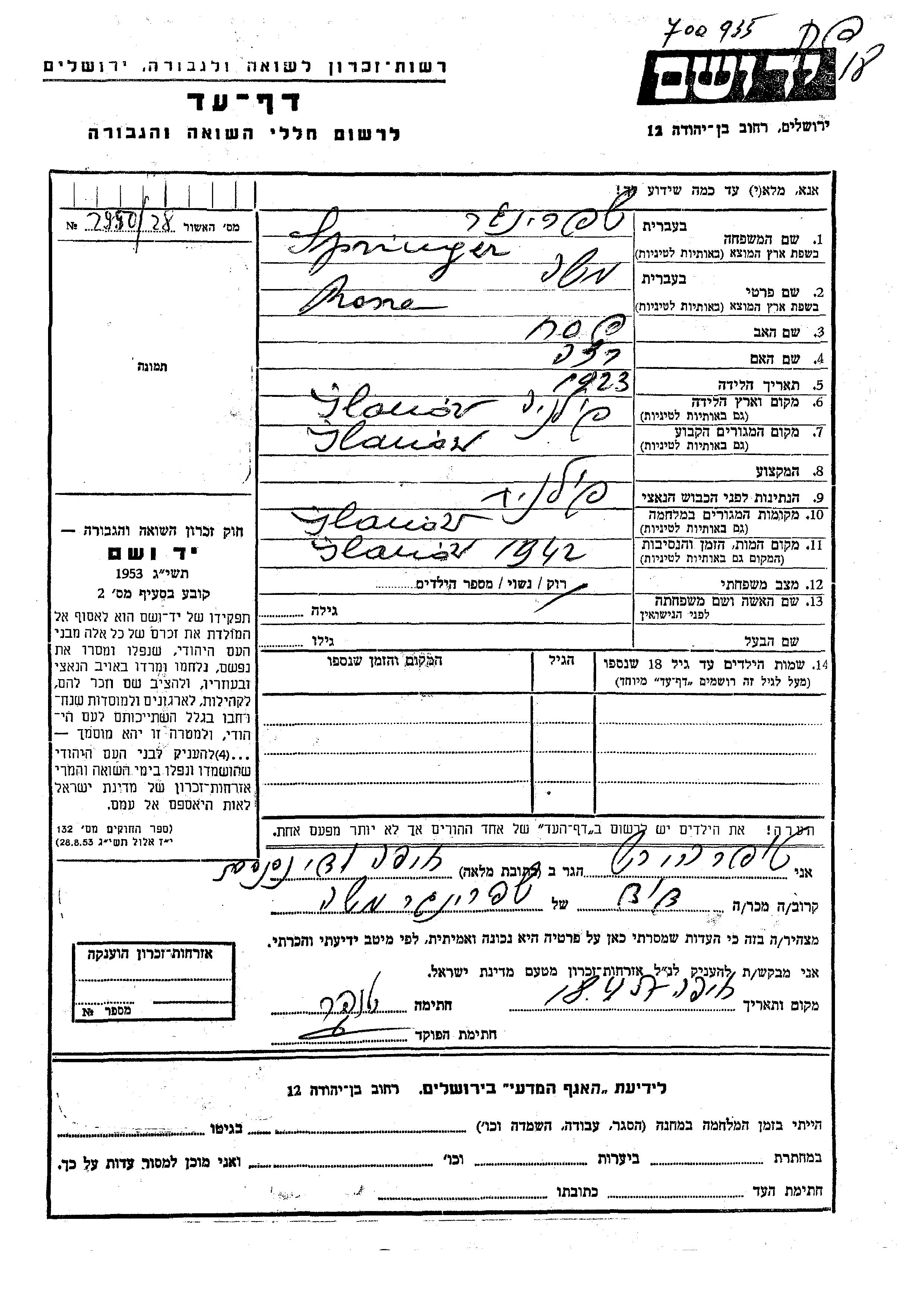 Mosze Springer was born in Gielniow, Poland, 1923 to Pesakh and Ratza. He was single. Prior to WWII he lived in Gielniow, Poland. During the war he was in Gielniow, Poland. Mosze was murdered in the Shoah. Place of death: Gielniow, Poland, 1942.