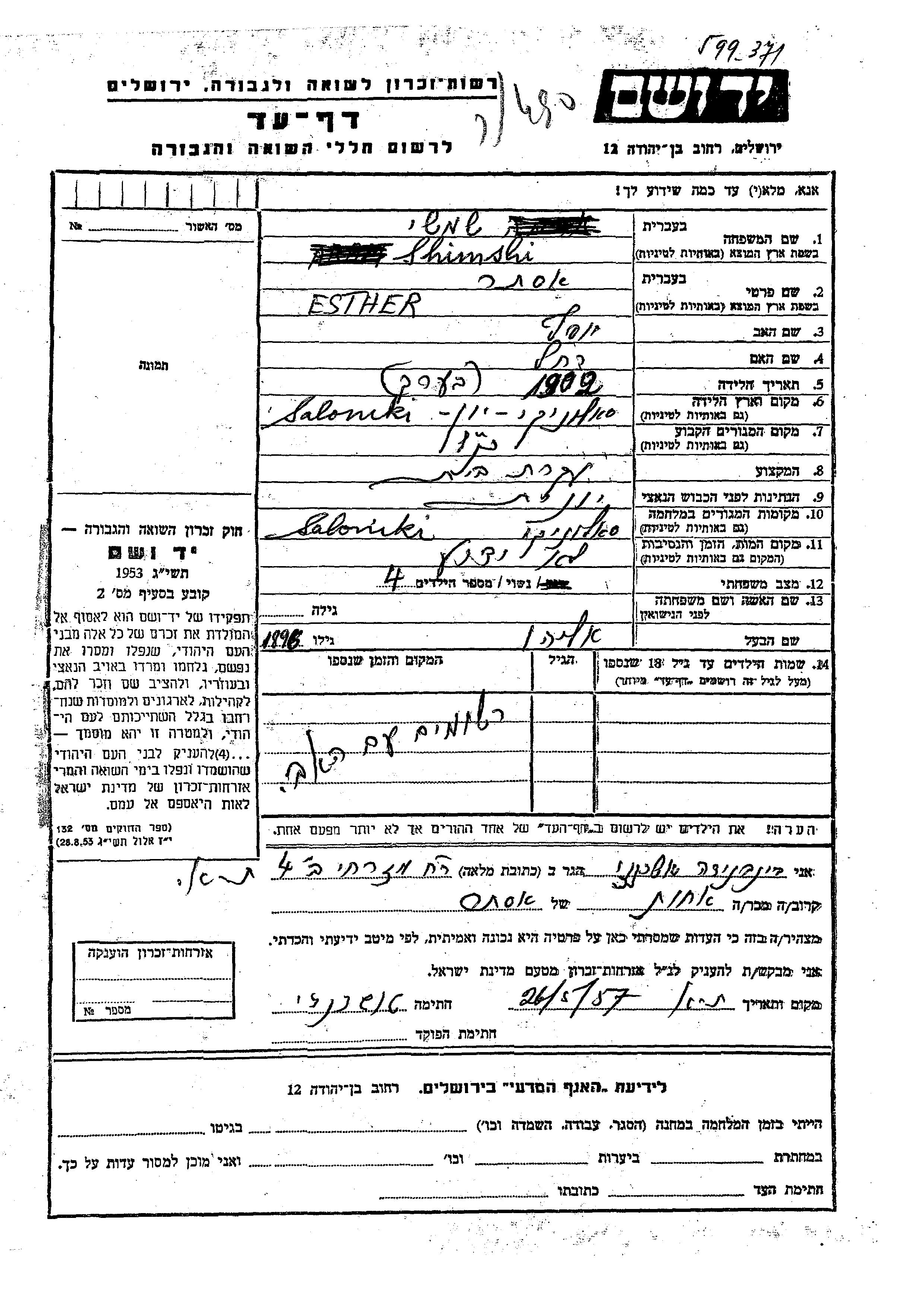 Esterina Simsi nee Koen was born in Saloniki, Greece, 1902. She was a housewife. Prior to WWII she lived in Thessaloniki, Greece. Esterina was murdered in the Shoah. Place of death: unstated place.