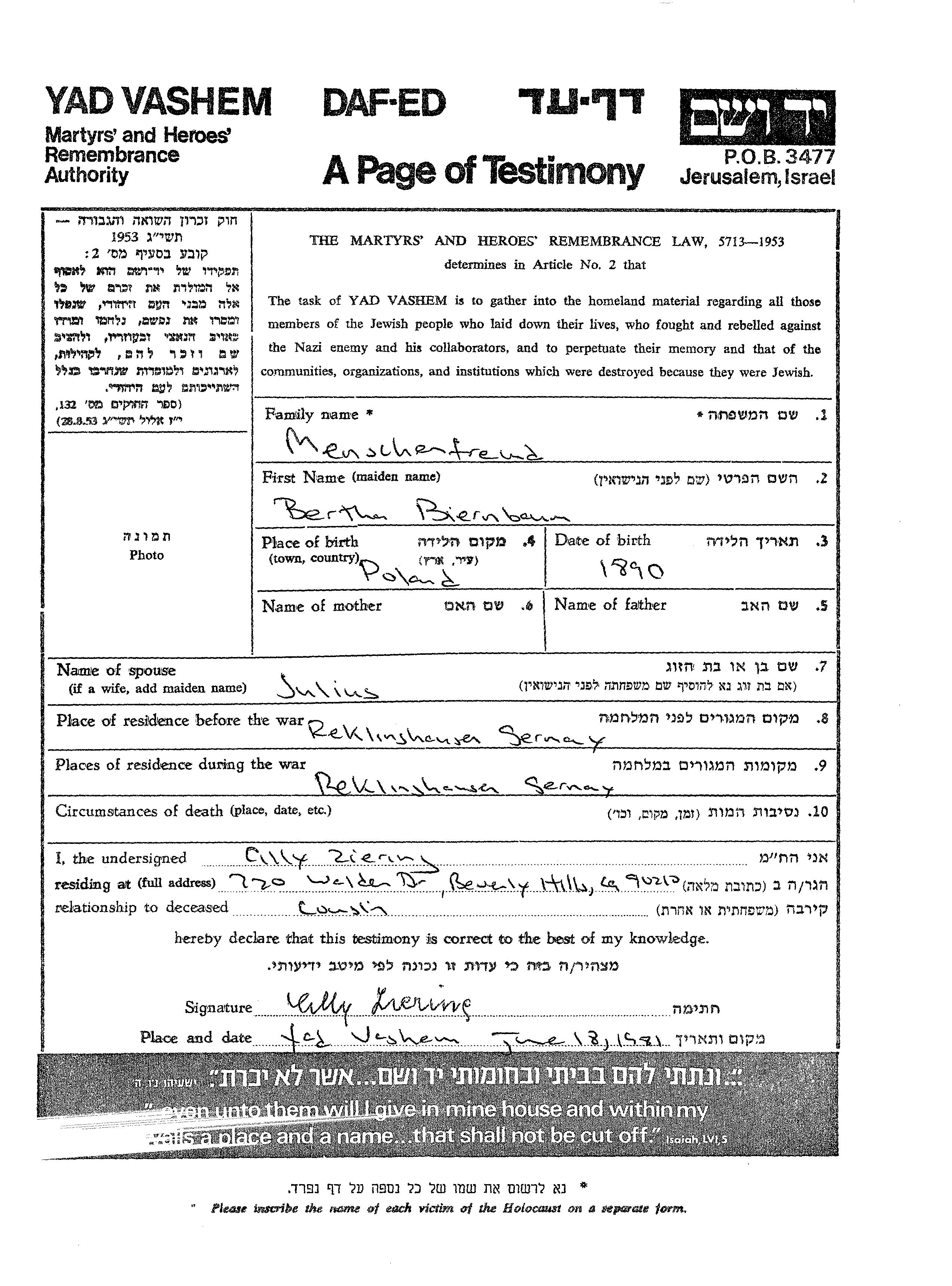 Bertha Menschenfreund nee Biernbaum was born in Poland, 1890. Prior to WWII she lived in Recklinghausen, Germany.