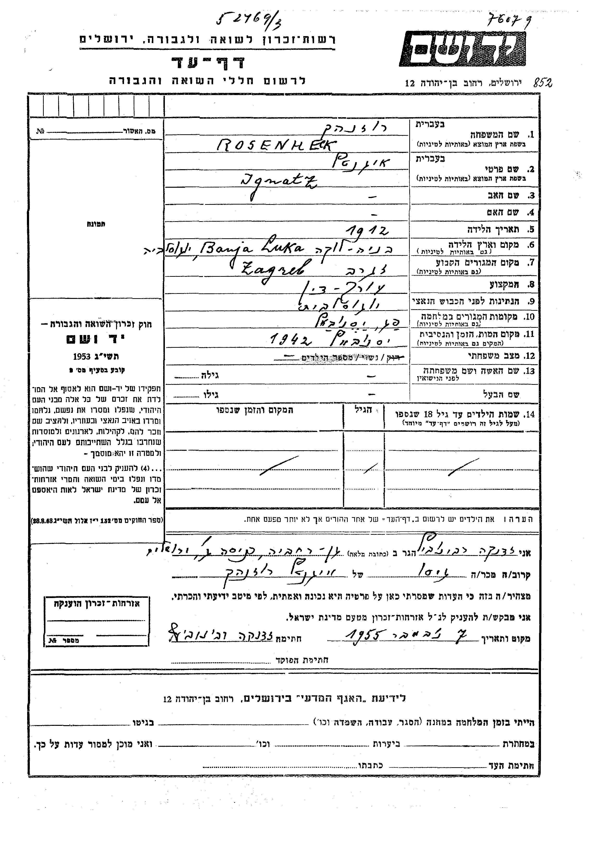 Ignatz Rosenheck was born in Banja Luka, Yugoslavia, 1912. He was a lawyer. Prior to WWII he lived in Zagreb, Yugoslavia. Ignatz was murdered in the Shoah. Place of death: unstated place, 1942.
