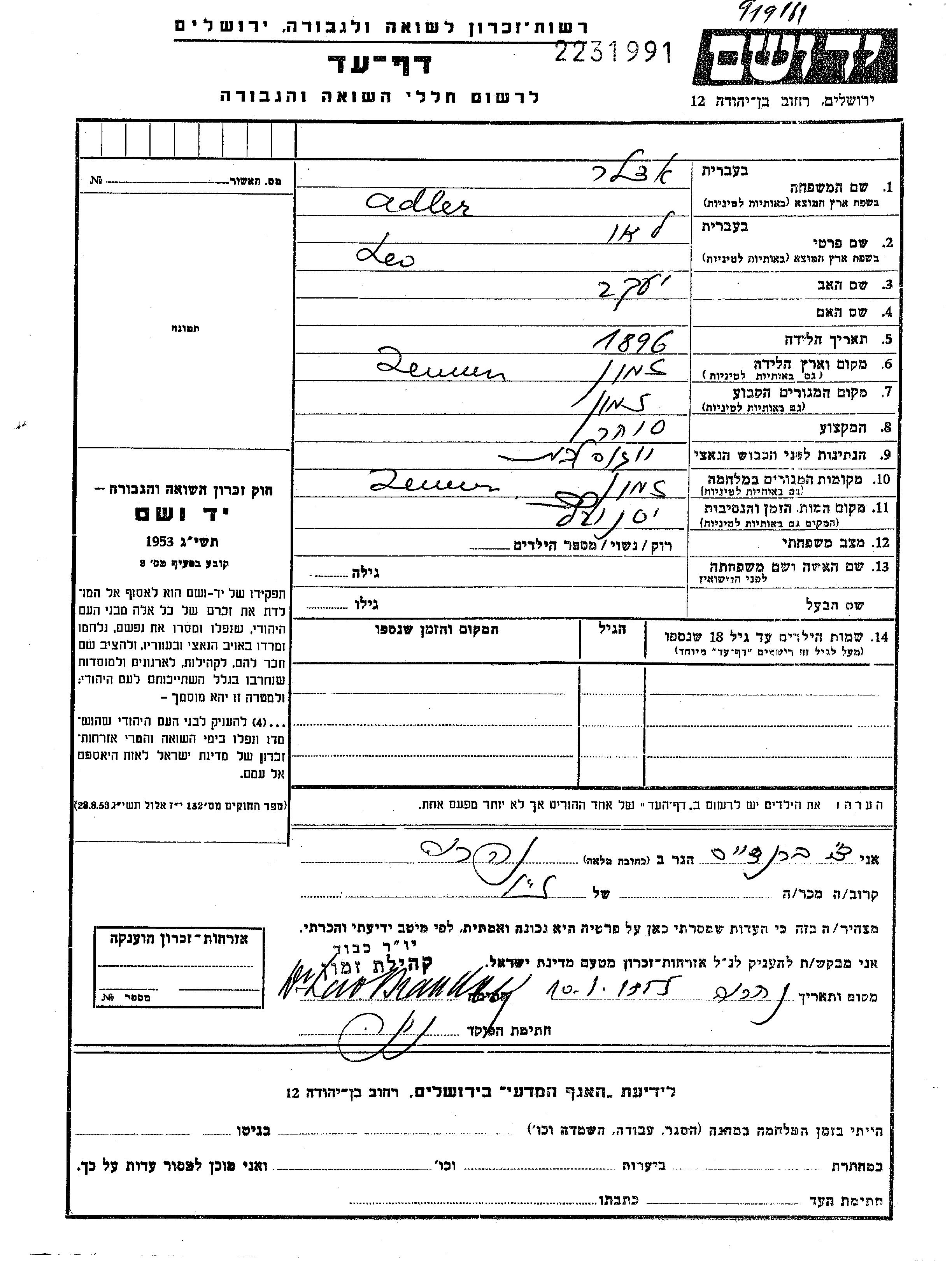 Adler Leo 1896 Zemun, Yugoslavia Page of Testimony