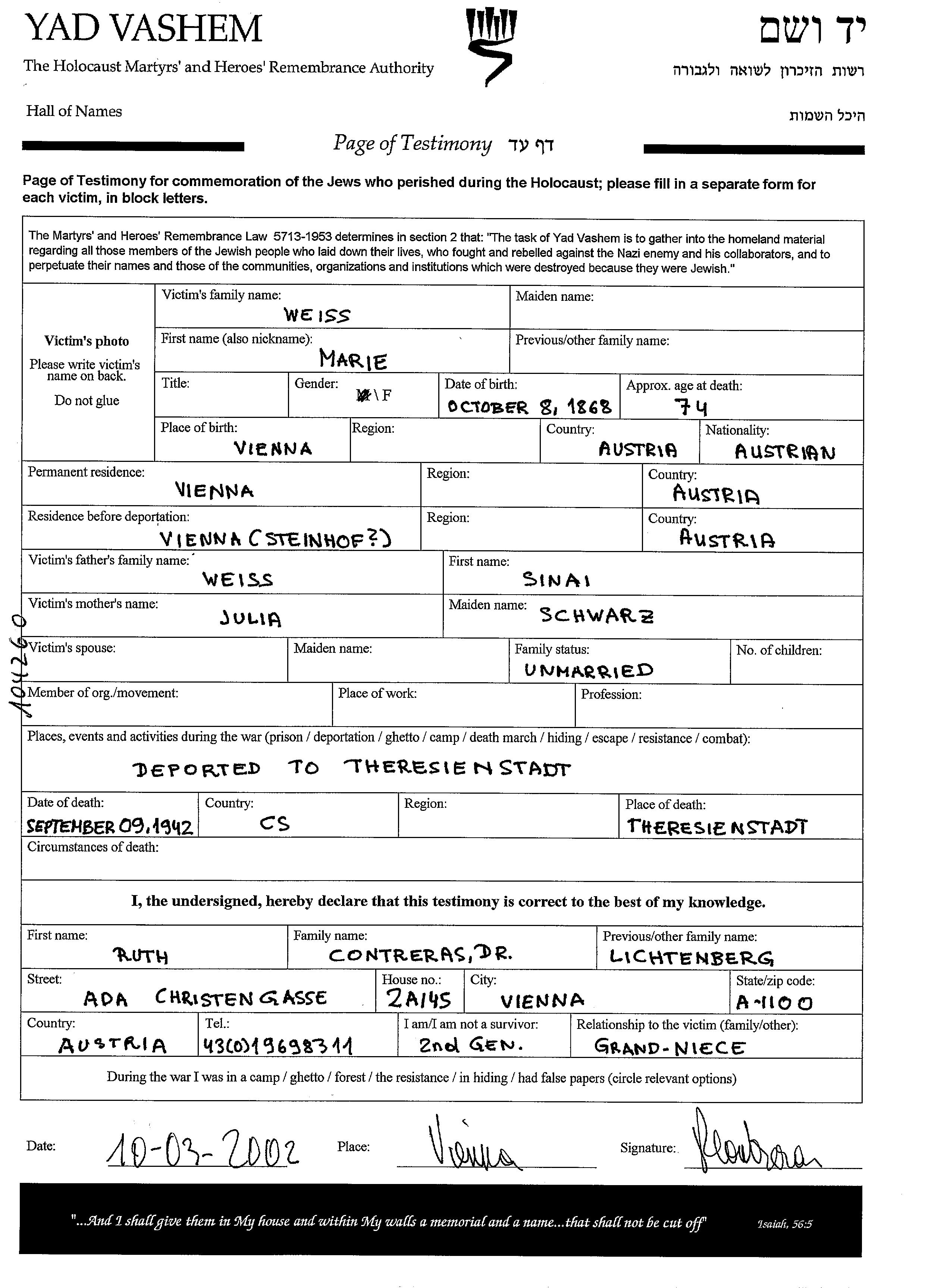 Weiss Marie 1868 Vienna, Austria Page of Testimony