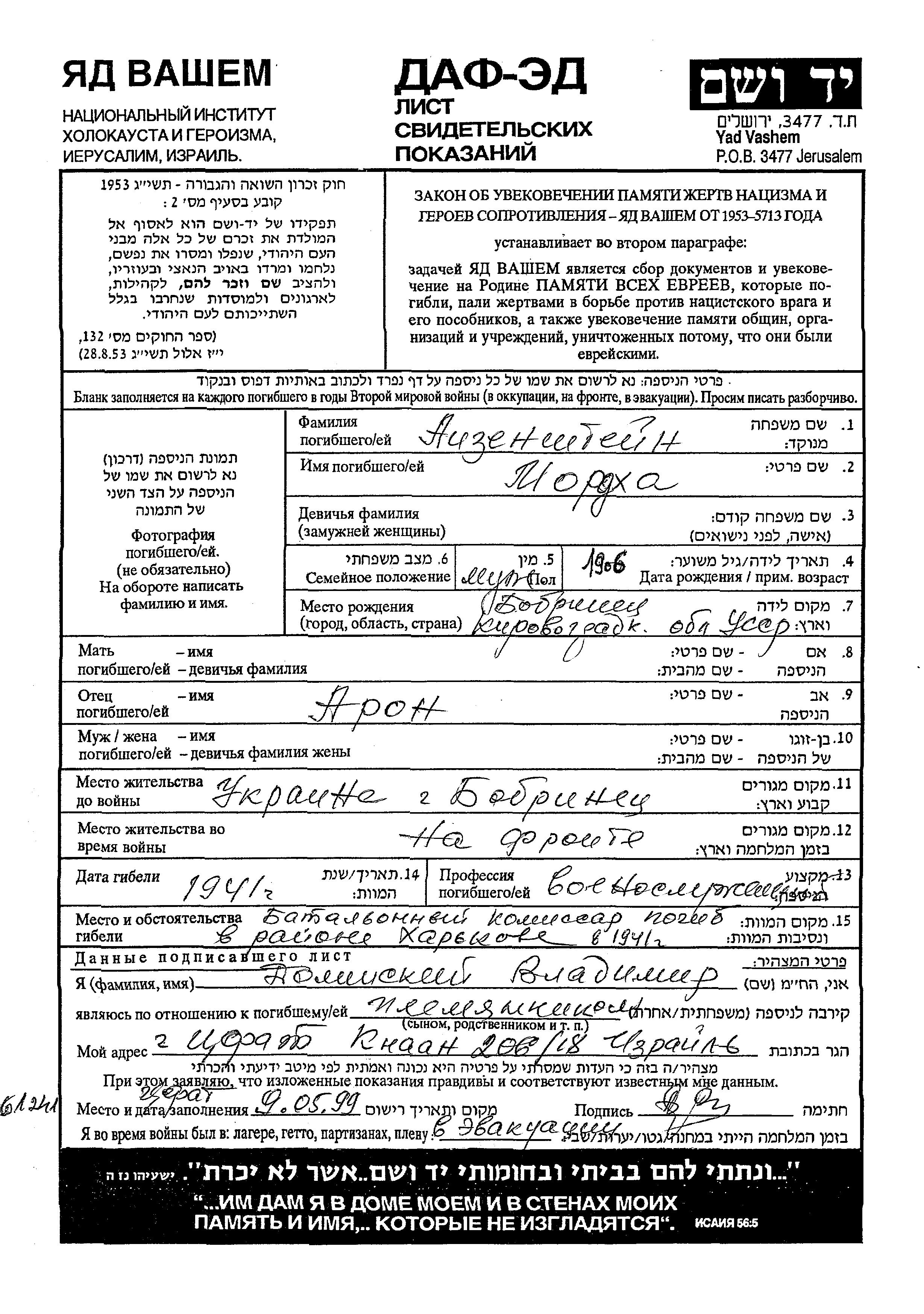 Mordkha Aizenshtein was born in Bobrinets, Ukraine (USSR), 1906. He was a party activist. Prior to WWII he lived in Bobrinets, Ukraine (USSR). Mordkha was killed in military service in WWII. Place of death: unstated place, 1941.