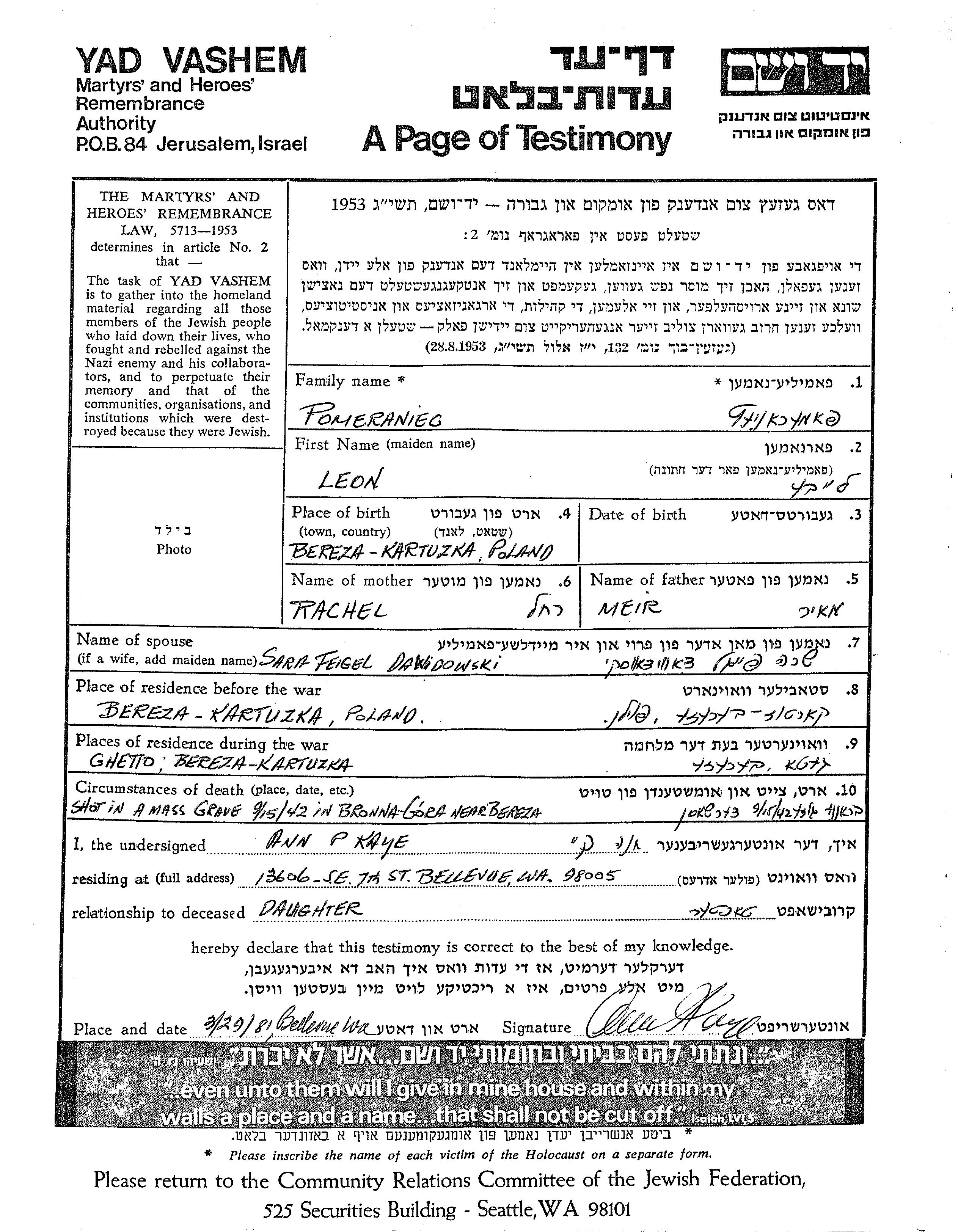 Pomeraniec Leibel Leon Bereza Kartuska, Poland Page of Testimony