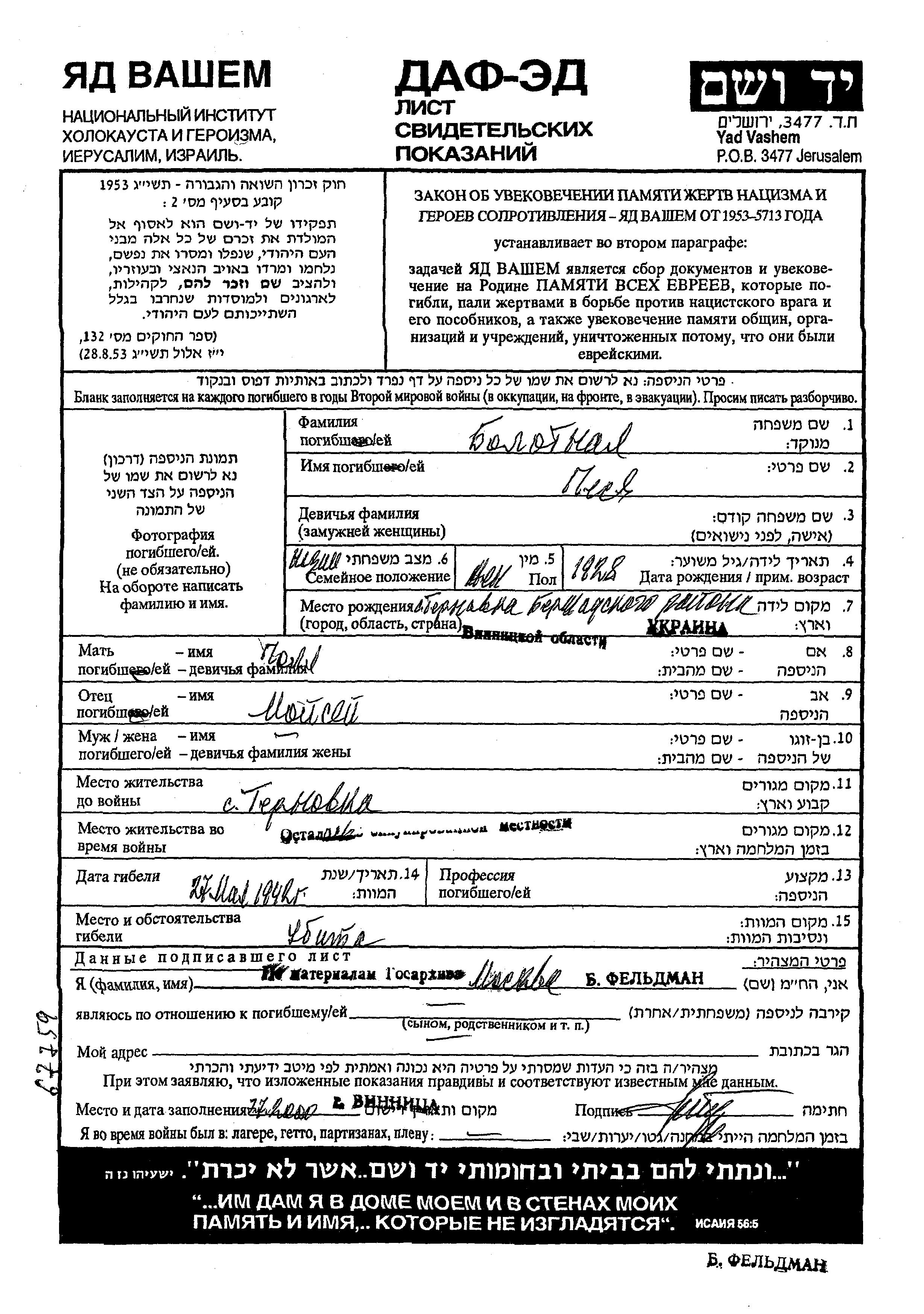 Yad Vashem - Pages of Testimony Names Memorial Collection