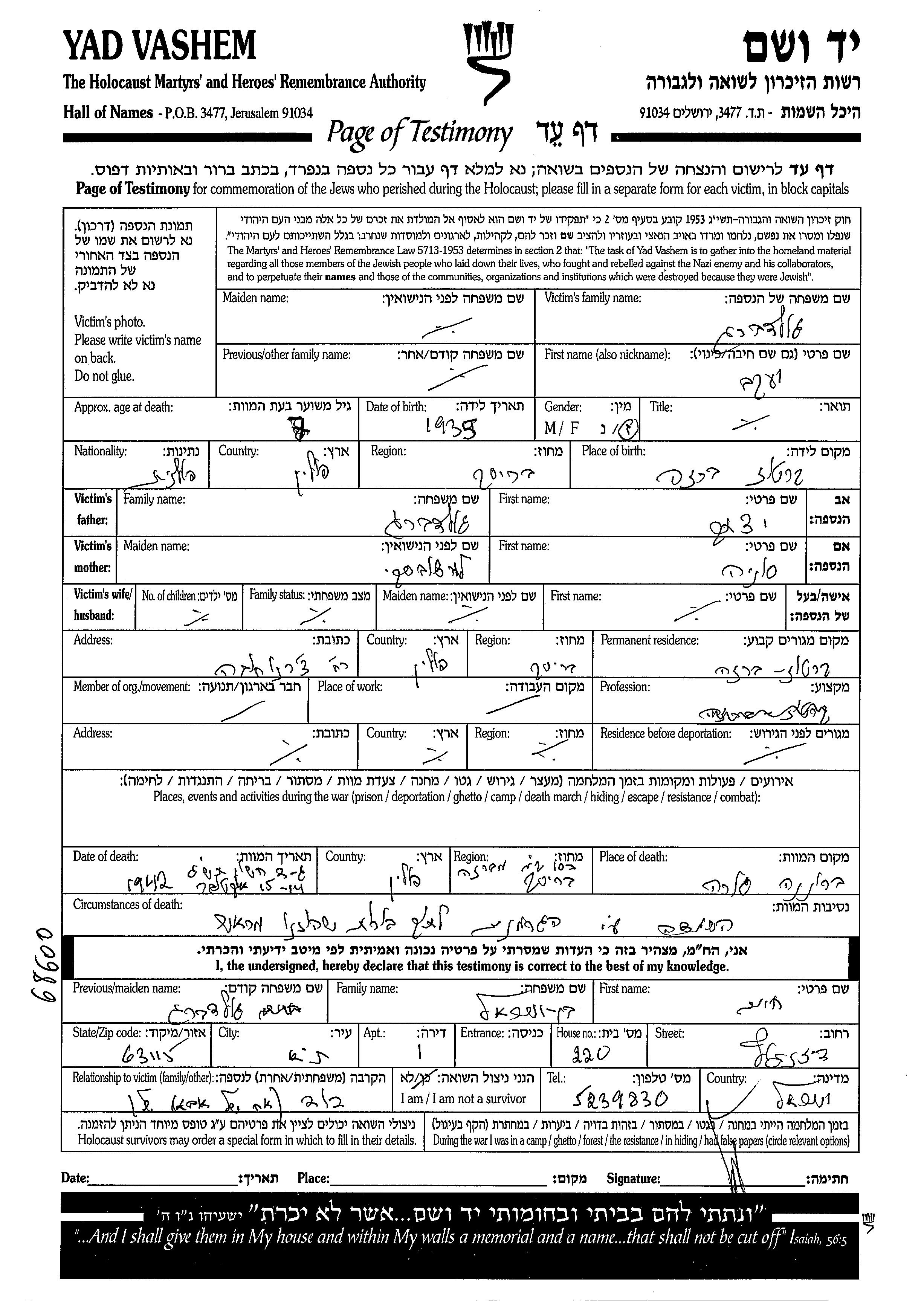 Yad Vashem - Pages of Testimony Names Memorial Collection