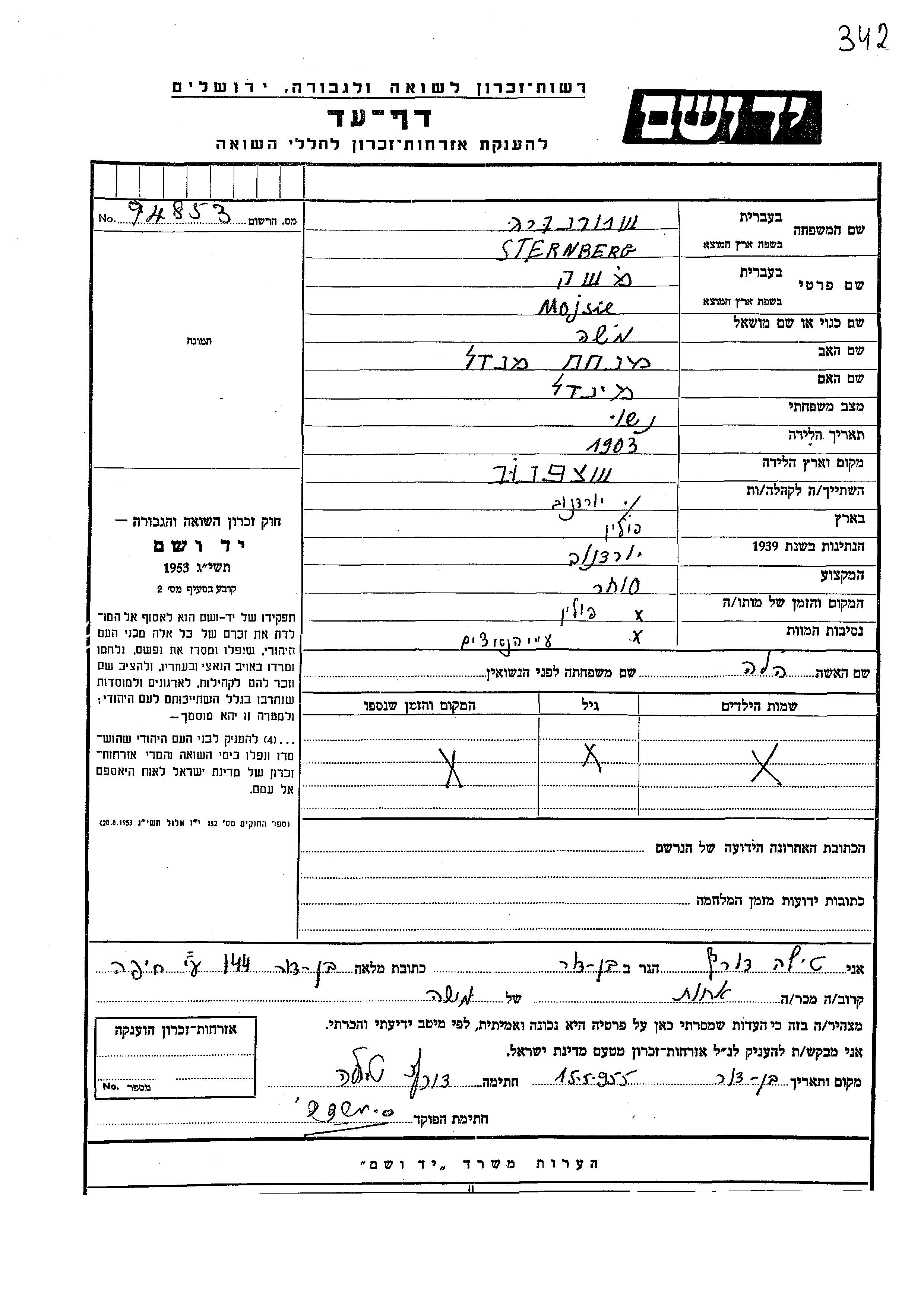 Sternberg Mojsie 1903 Jordanow, Poland Page of Testimony