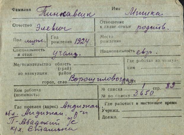 | Pinkavetzk | Mishka | 1924 | Voroshilovgrad, Ukraine (USSR) | List of evacuated persons |