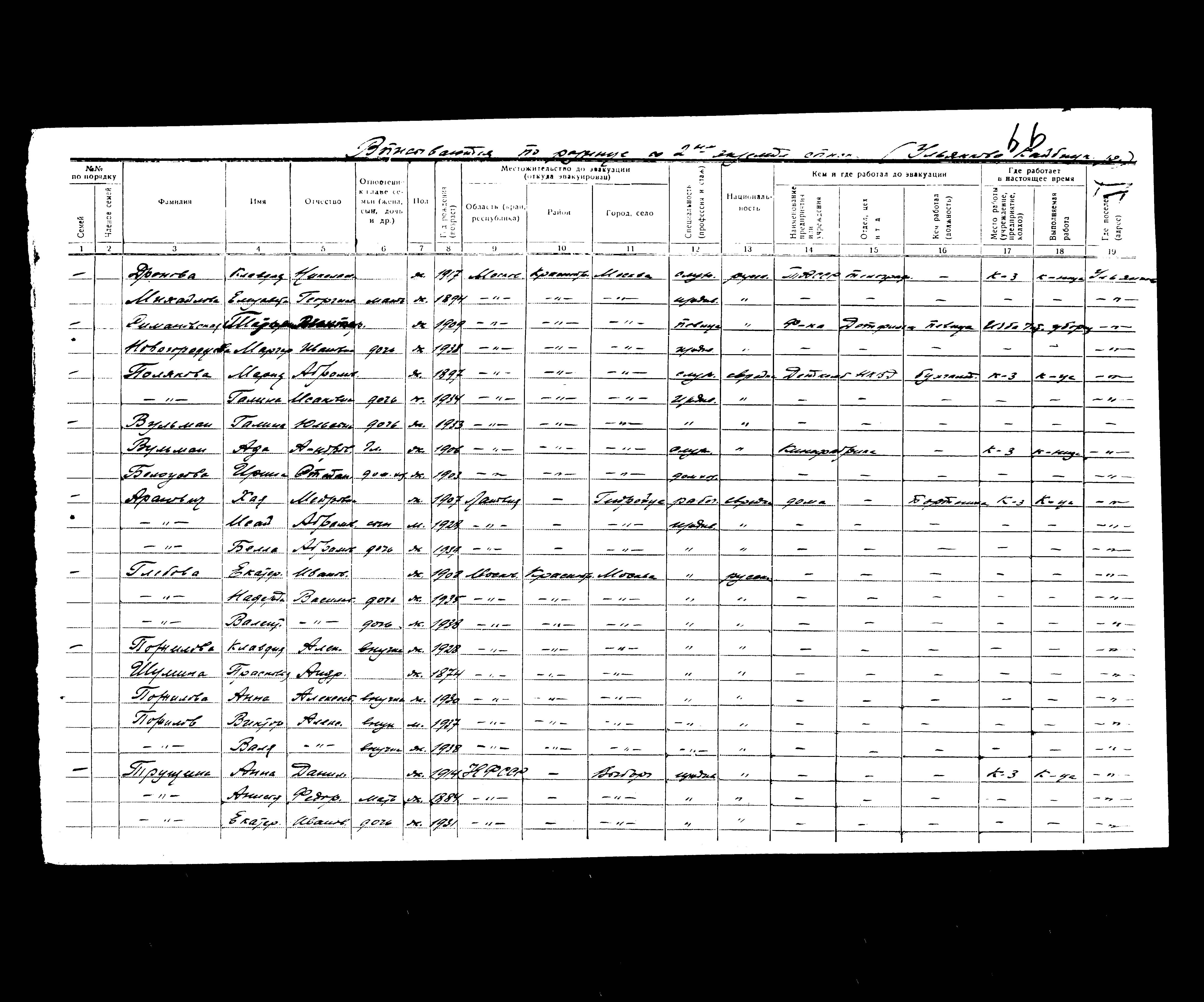 Maria Polyakova was born, 1897. Prior to WWII she lived in Moskva, Russia (USSR). Maria was registered following the evacuation/ in the interior of the Soviet Union.