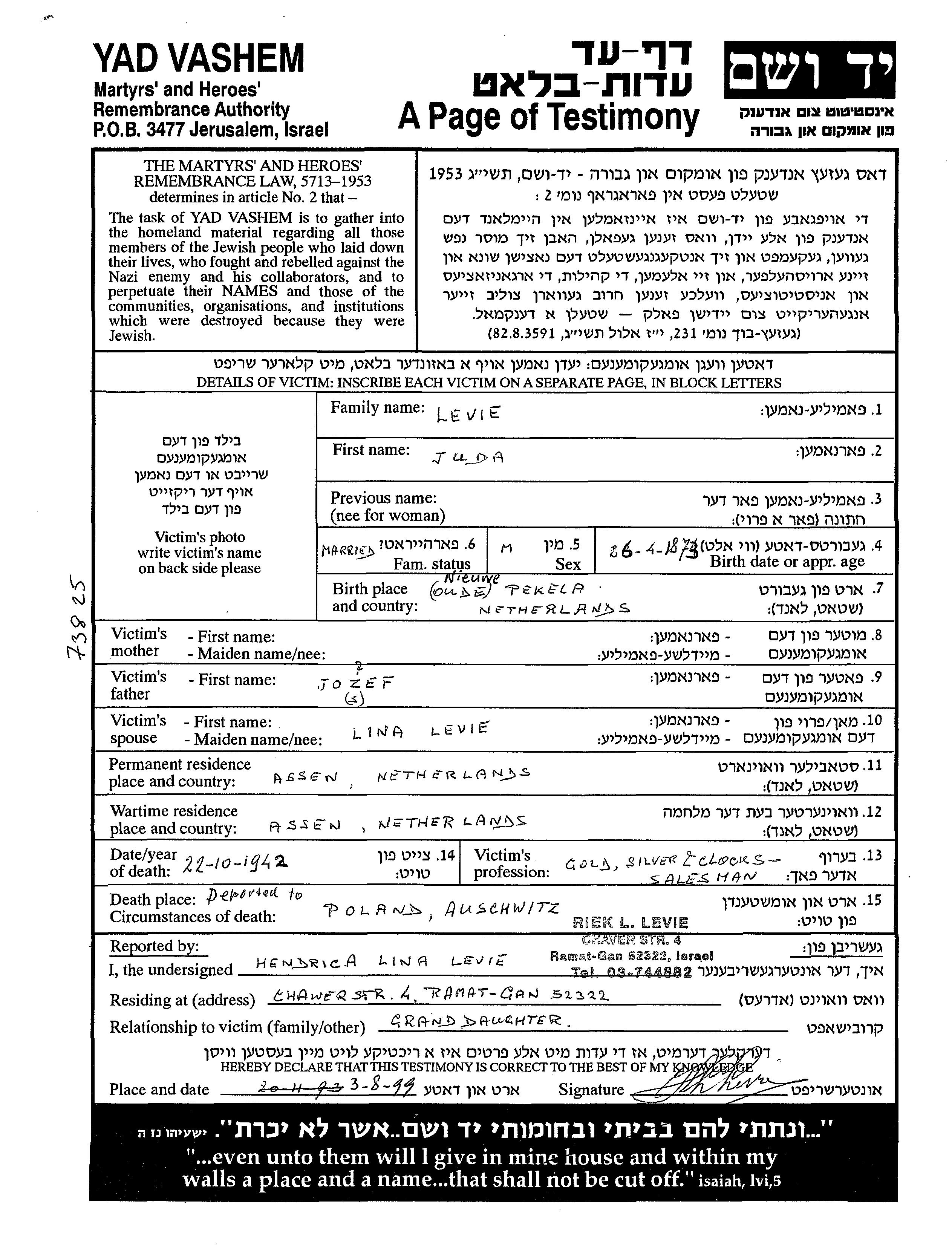 Juda Levie was born in Nieuwe Pekela, The Netherlands, 1873. He was a salesman. Prior to WWII he lived in Assen, The Netherlands. Juda was murdered in the Shoah. Place of death: Auschwitz, Poland, 1942.