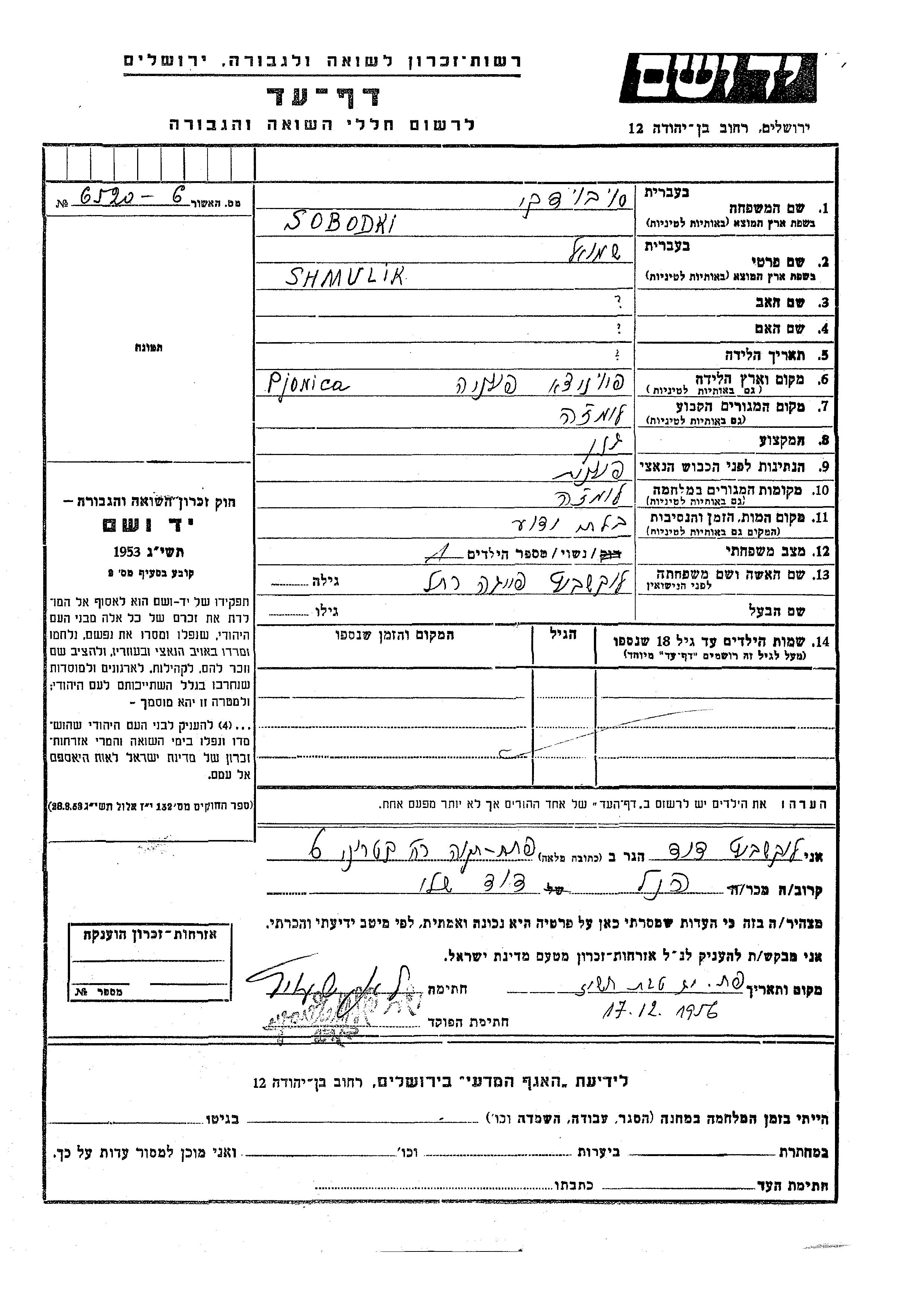 Shmulik Sobodki was born in Piatnica, Poland. He was a gardener and married to Feiga Rakhel nee Lokshevitz. Prior to WWII he lived in Łomża, Poland. During the war he was in Łomża, Poland. Shmulik was murdered in the Shoah.