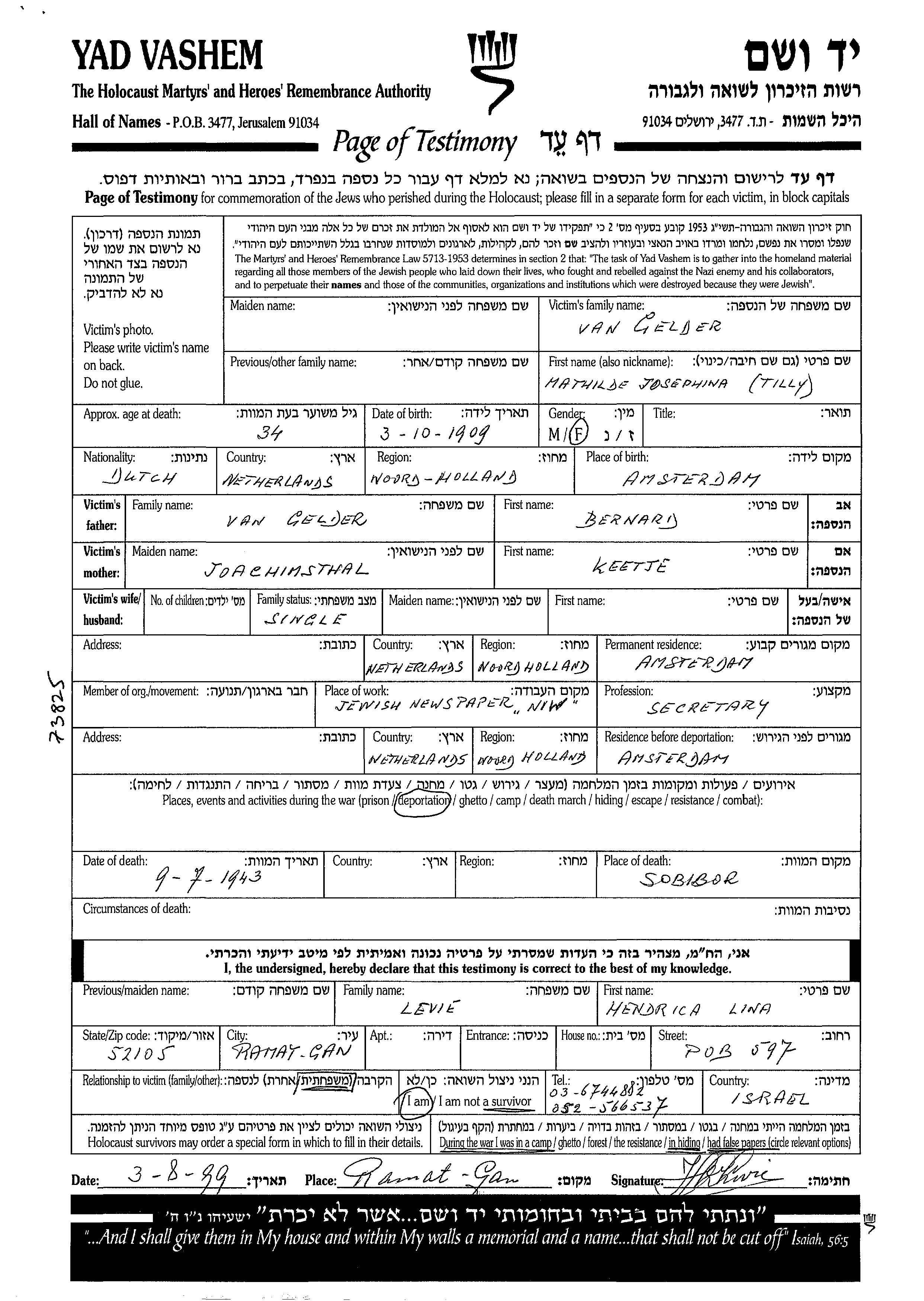 Mathilde Josephme Gelder van was born in Amsterdam, The Netherlands, 1909. She was a secretary. Prior to WWII she lived in Amsterdam, The Netherlands. Mathilde Josephme was murdered in the Shoah. Place of death: unstated place, 1943.