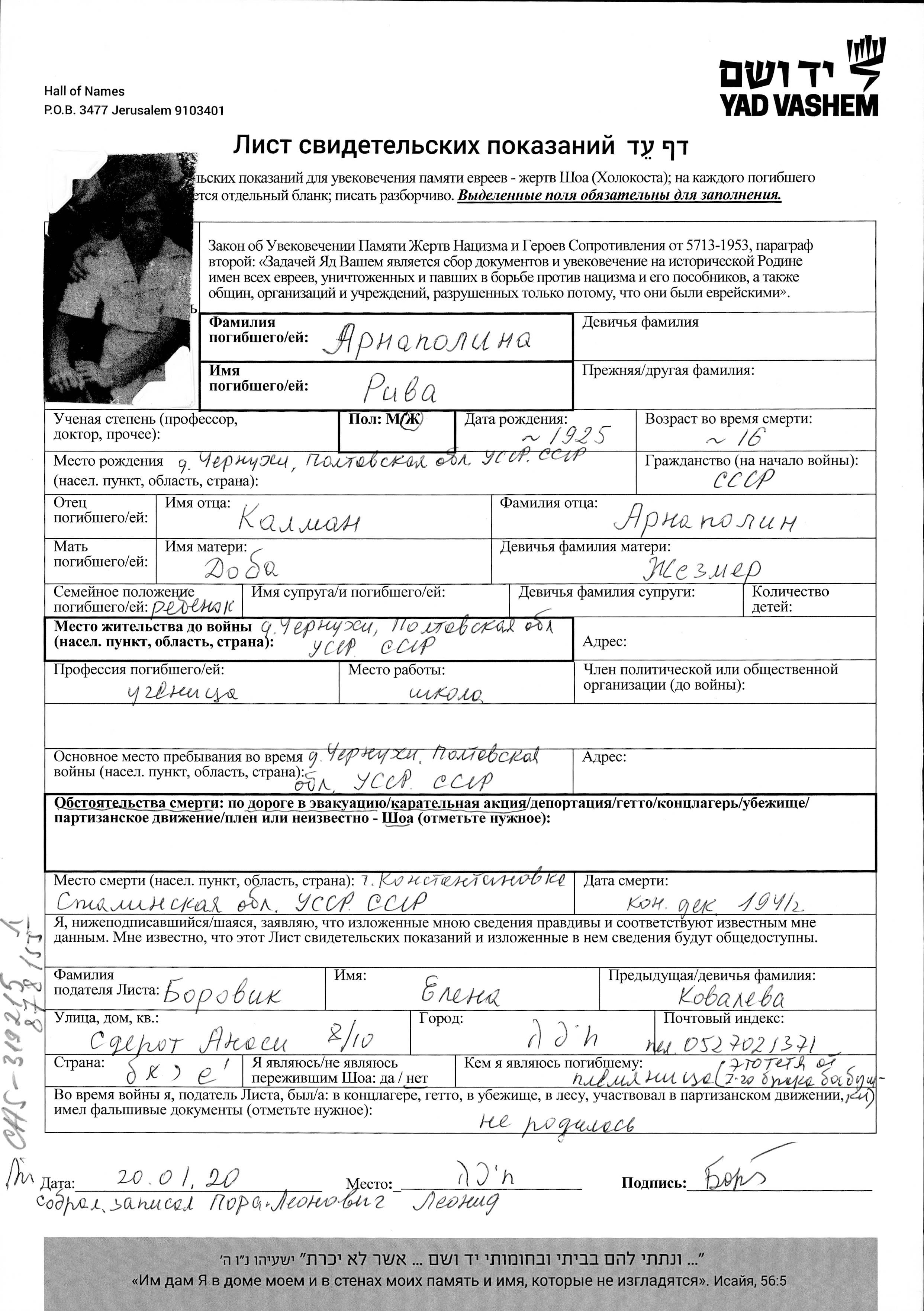 Riva Arnapolina was born in Chernukhi, Ukraine (USSR), 1925. She was a pupil. Prior to WWII she lived in Chernukhi, Ukraine (USSR). Riva was murdered in the Shoah. Place of death: unstated place, 1941.