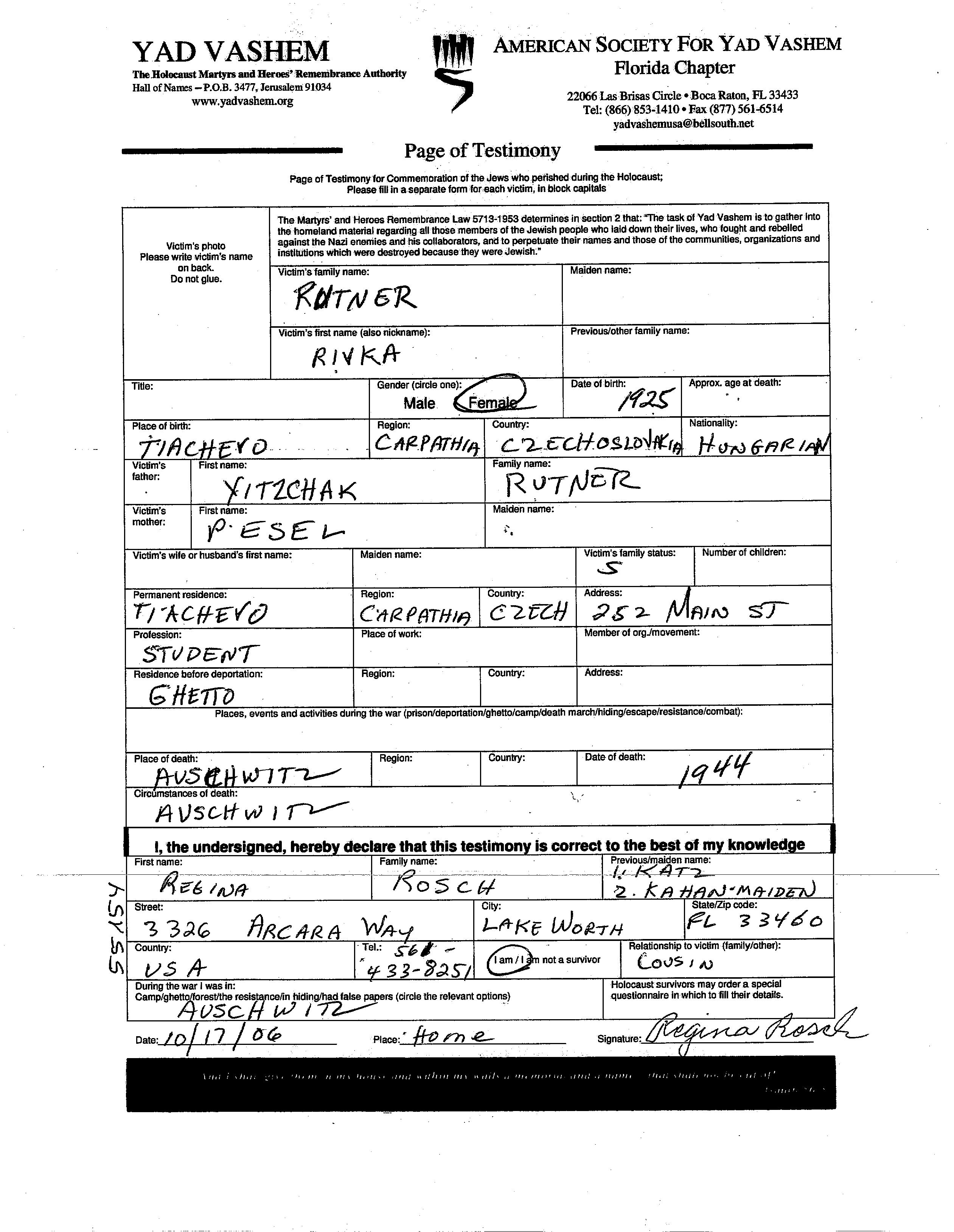 Rivka Rutner was born in Tacovo, Czechoslovakia, 1925. She was a student. Prior to WWII she lived in Tacovo, Czechoslovakia. Rivka was murdered in the Shoah. Place of death: unstated place, 1944.