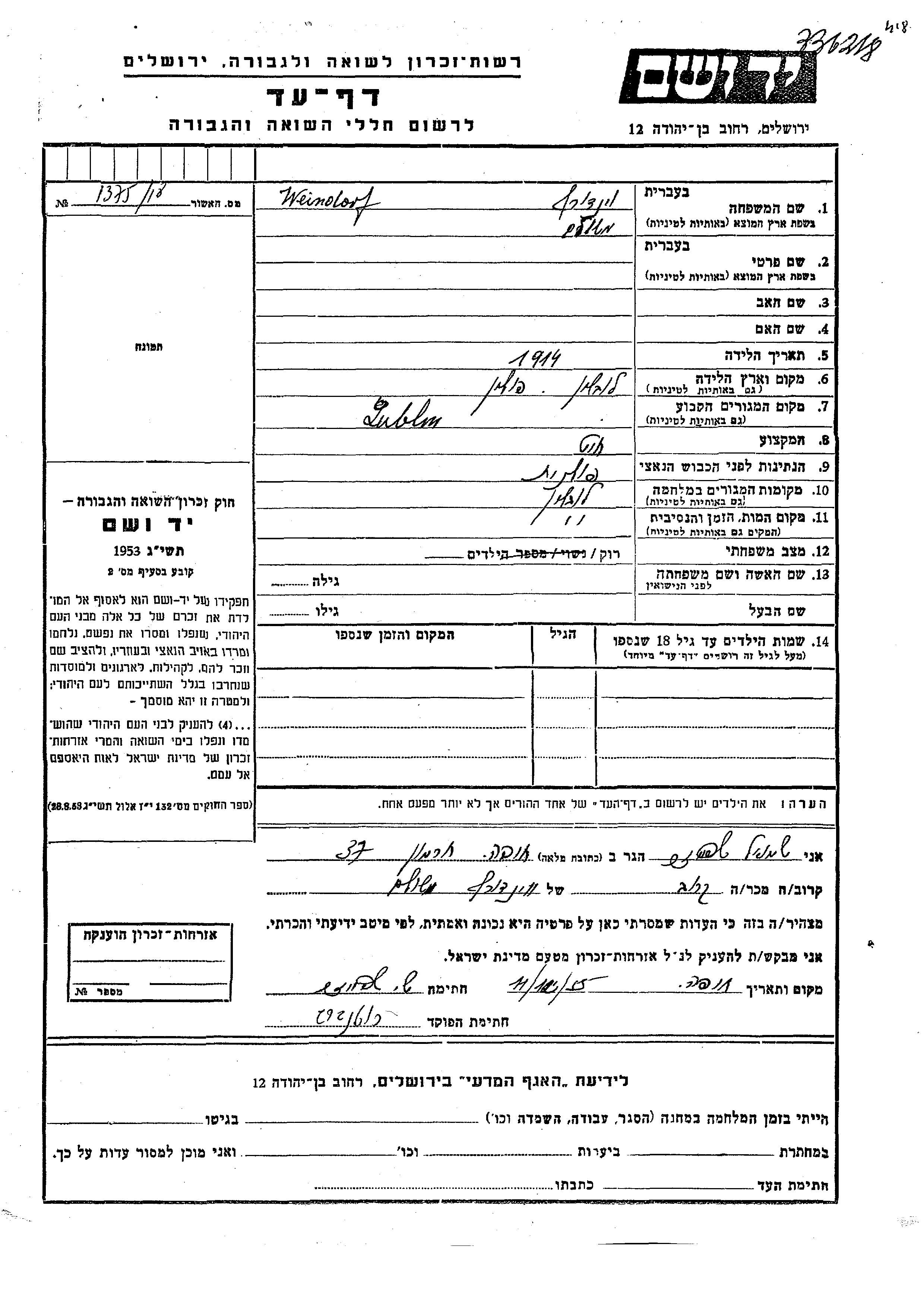 Weindorf Meshulam 1914 Lublin, Poland Page of Testimony