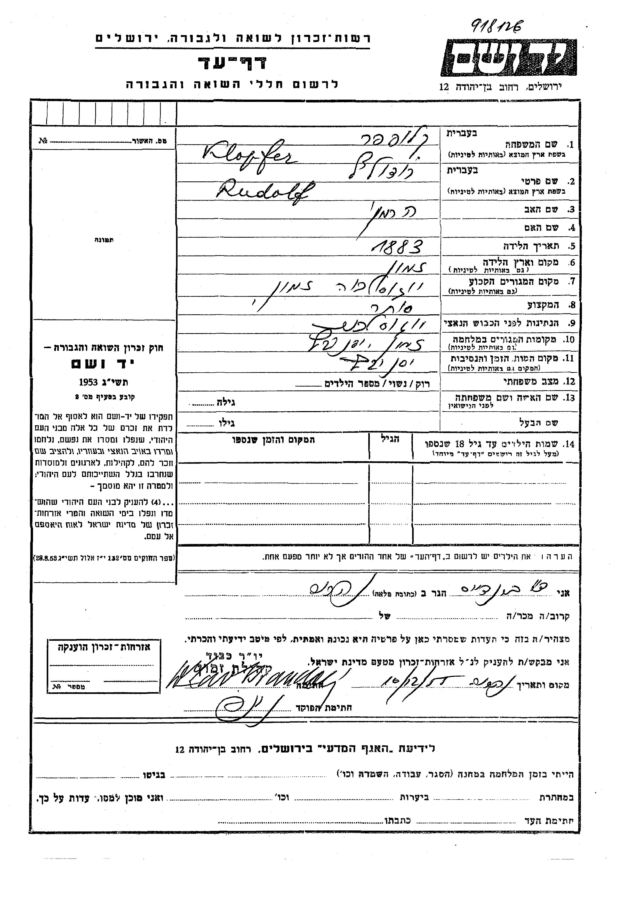 Klopfer Rudolf 1883 Zemun, Yugoslavia Page of Testimony