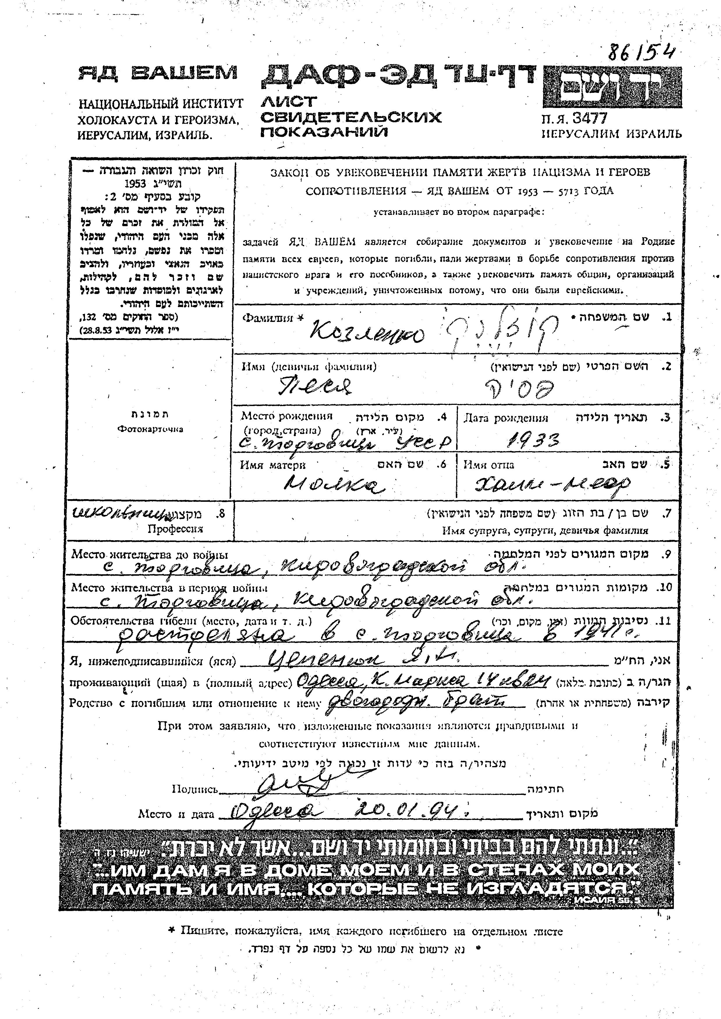 Pesia Kozlenko was born in Torgovitsa, Ukraine (USSR), 1933. She was a pupil. Prior to WWII she lived in Torgovitsa, Ukraine (USSR). Pesia was murdered in the Shoah. Place of death: Torgovitsa, Ukraine (USSR), 1941.