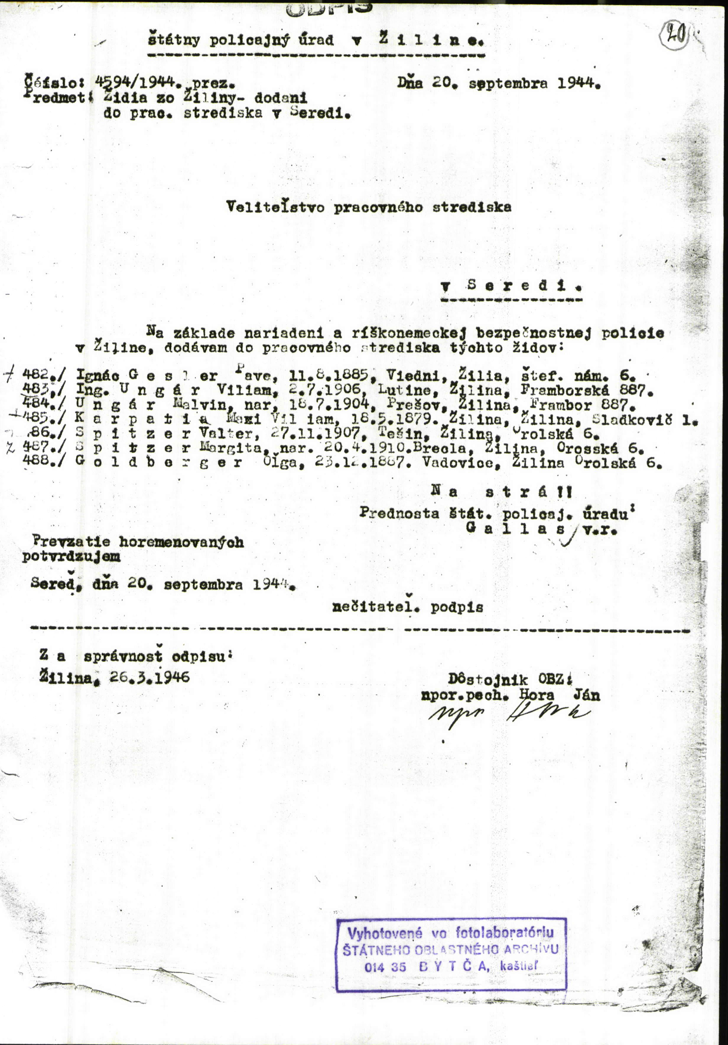 Viliam Ungar was born in Lutina, Czechoslovakia, 1906. He was an engineer. Prior to WWII he lived in Zilina, Czechoslovakia.