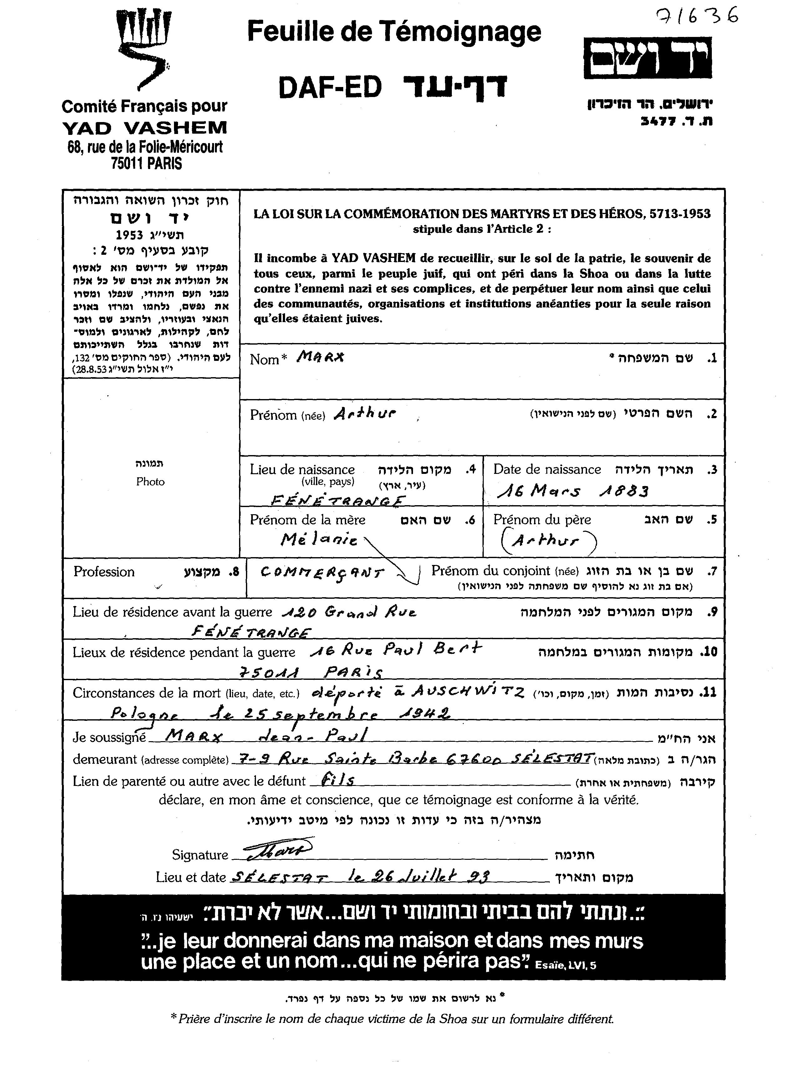 Marx Arthur 1883 Fenetrange, France Page of Testimony