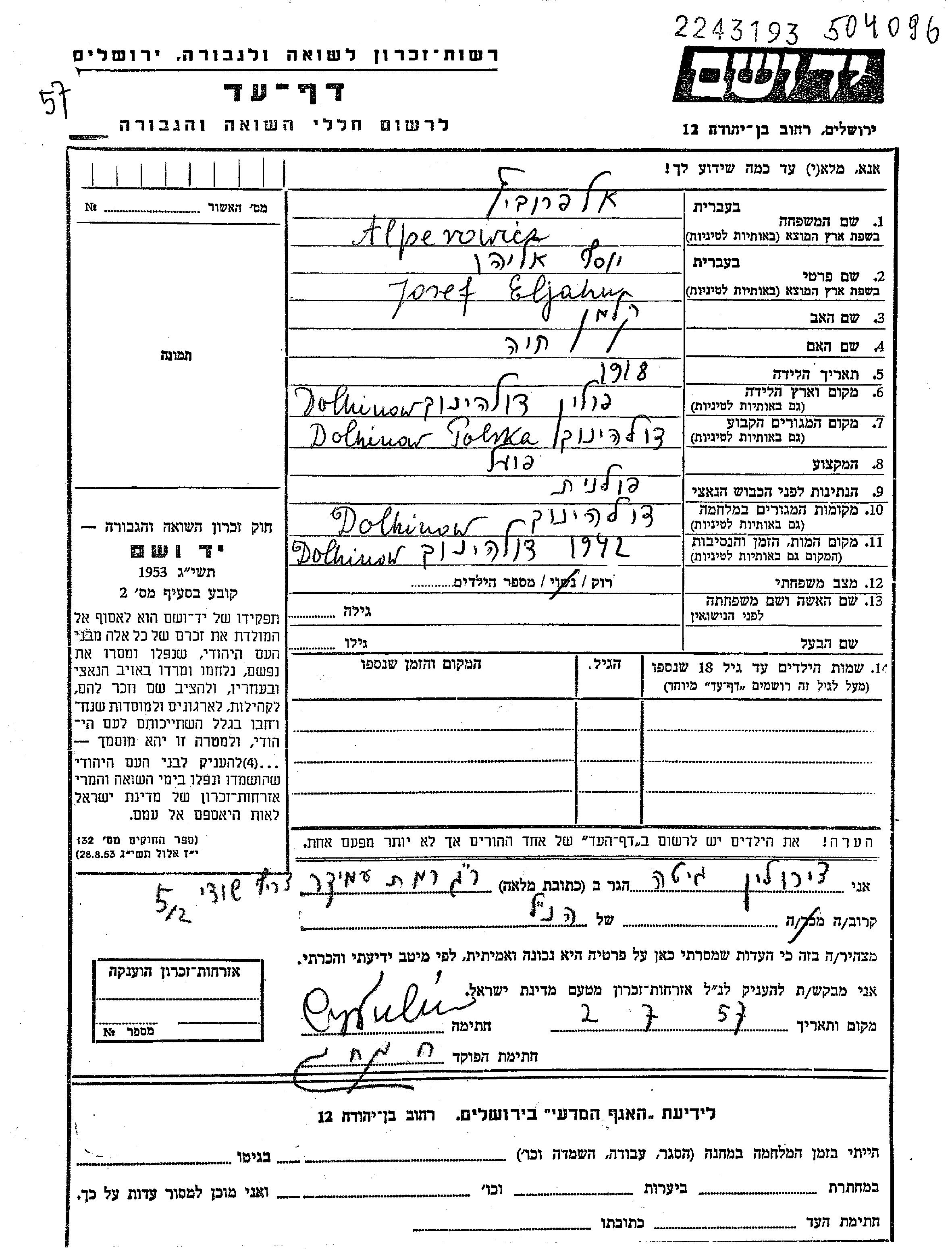 Josef Eljahu Alperowicz was born in Dolhinow, Poland, 1918. He was a worker. Prior to WWII he lived in Dolhinow, Poland.