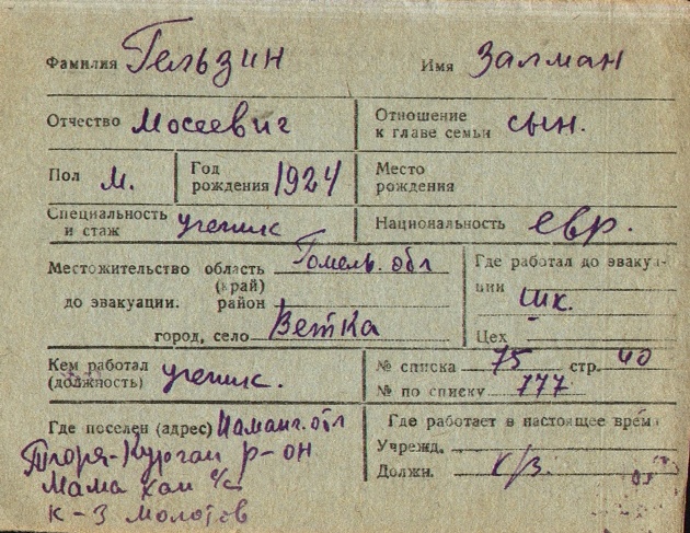 Zalman Gelzin was born in Vetka, Belorussia (USSR), 1924. Prior to WWII he lived in Vetka, Belorussia (USSR). Zalman was killed in military service in WWII. Place of death: Wolyn, Poland, 09/05/1944.