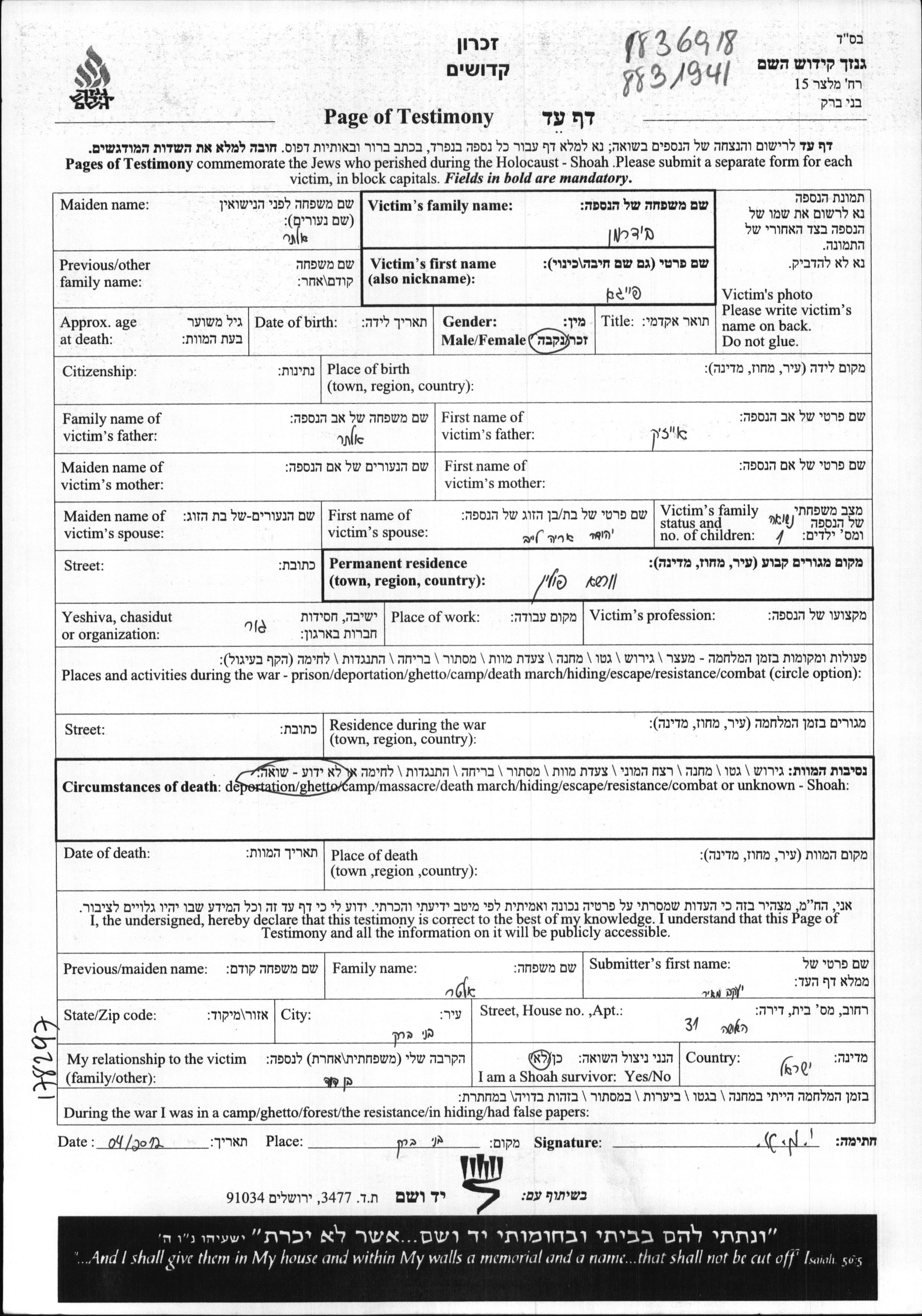 Yad Vashem - Pages of Testimony Names Memorial Collection