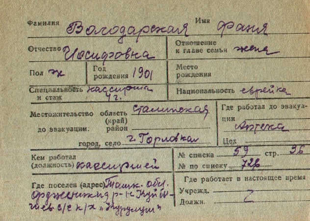 Fanya Volodarskaya nee Reznik was born in Steblev, Ukraine (USSR), 1901. Prior to WWII she lived in Gorlovka, Ukraine (USSR). Fanya was registered following the evacuation/ in the interior of the Soviet Union.