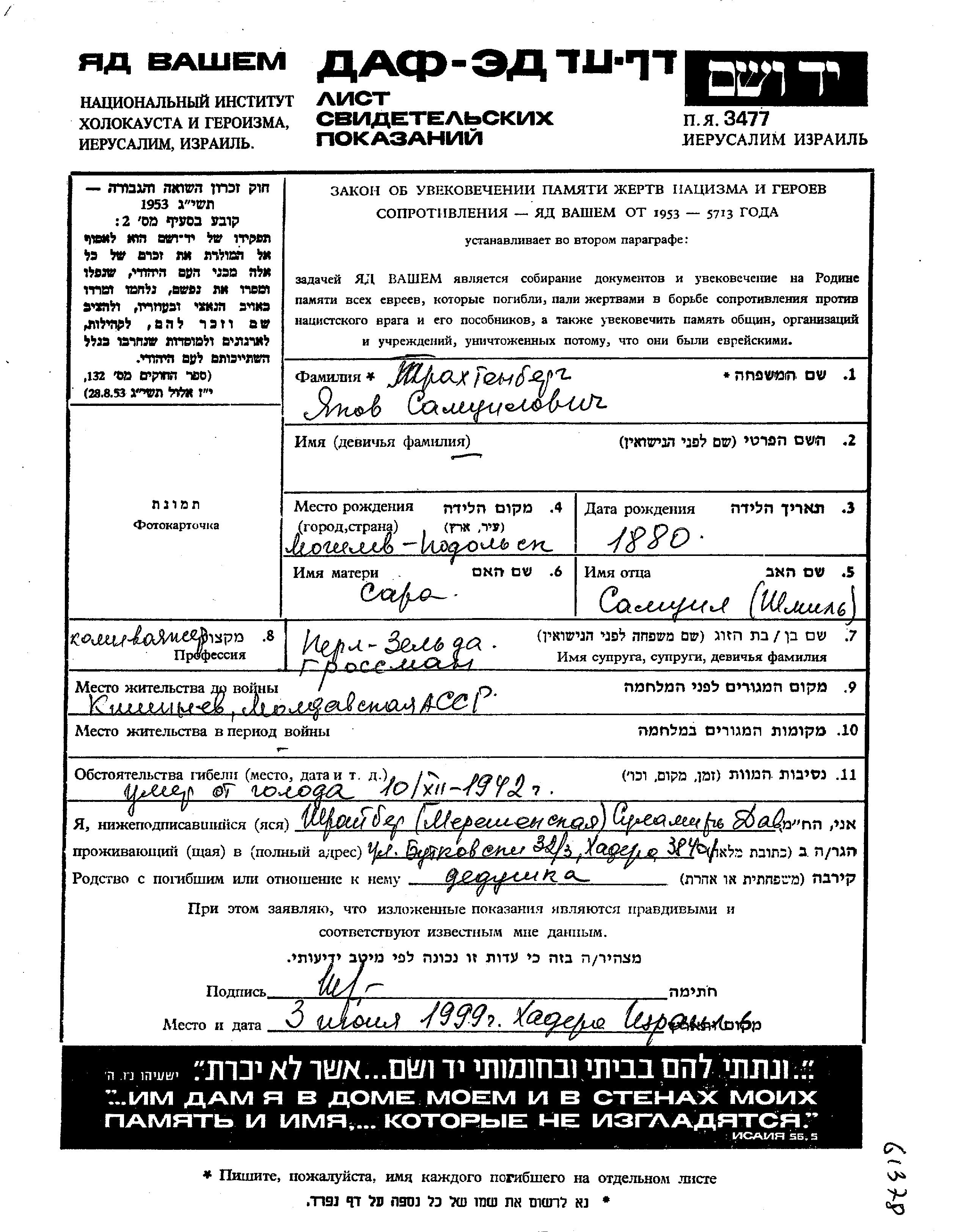 Yakov Trakhtenberg was born in Mogilev Podolskiy, Ukraine (USSR), 1880. He was a komiwojazer. Prior to WWII he lived in Kishinev, Romania. Yakov was registered following the evacuation/ in the interior of the Soviet Union.