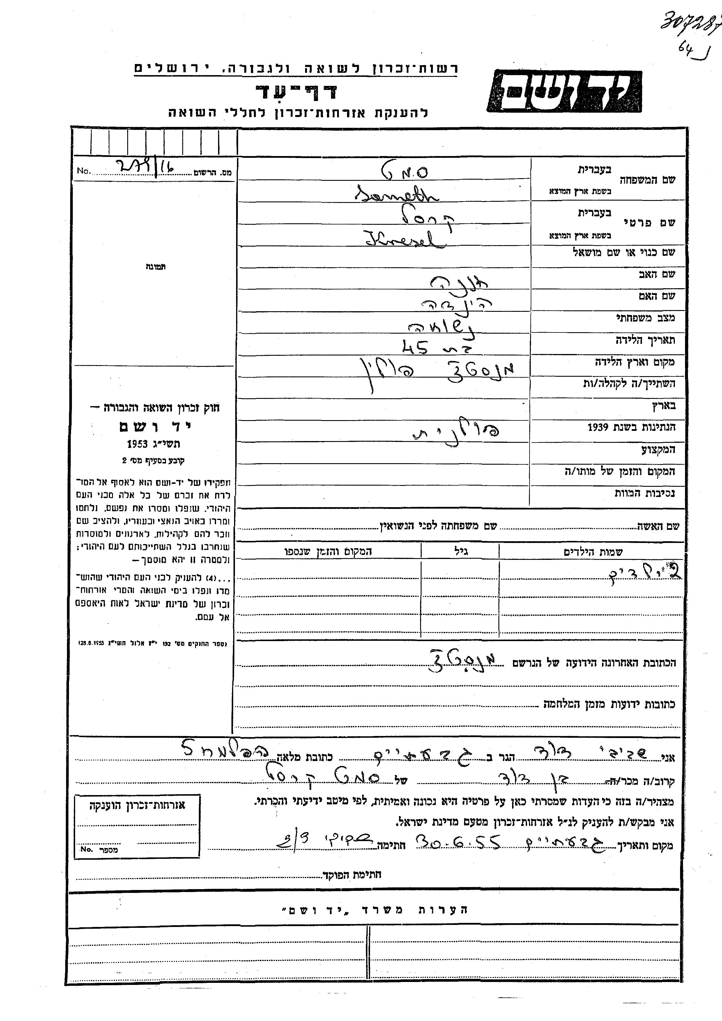 Krusla Sameth was born in Manasterz, Poland to Khanna and Hinda. She was married. Prior to WWII she lived in Manasterz, Poland. During the war she was in Manasterz, Poland. Krusla was murdered in the Shoah.