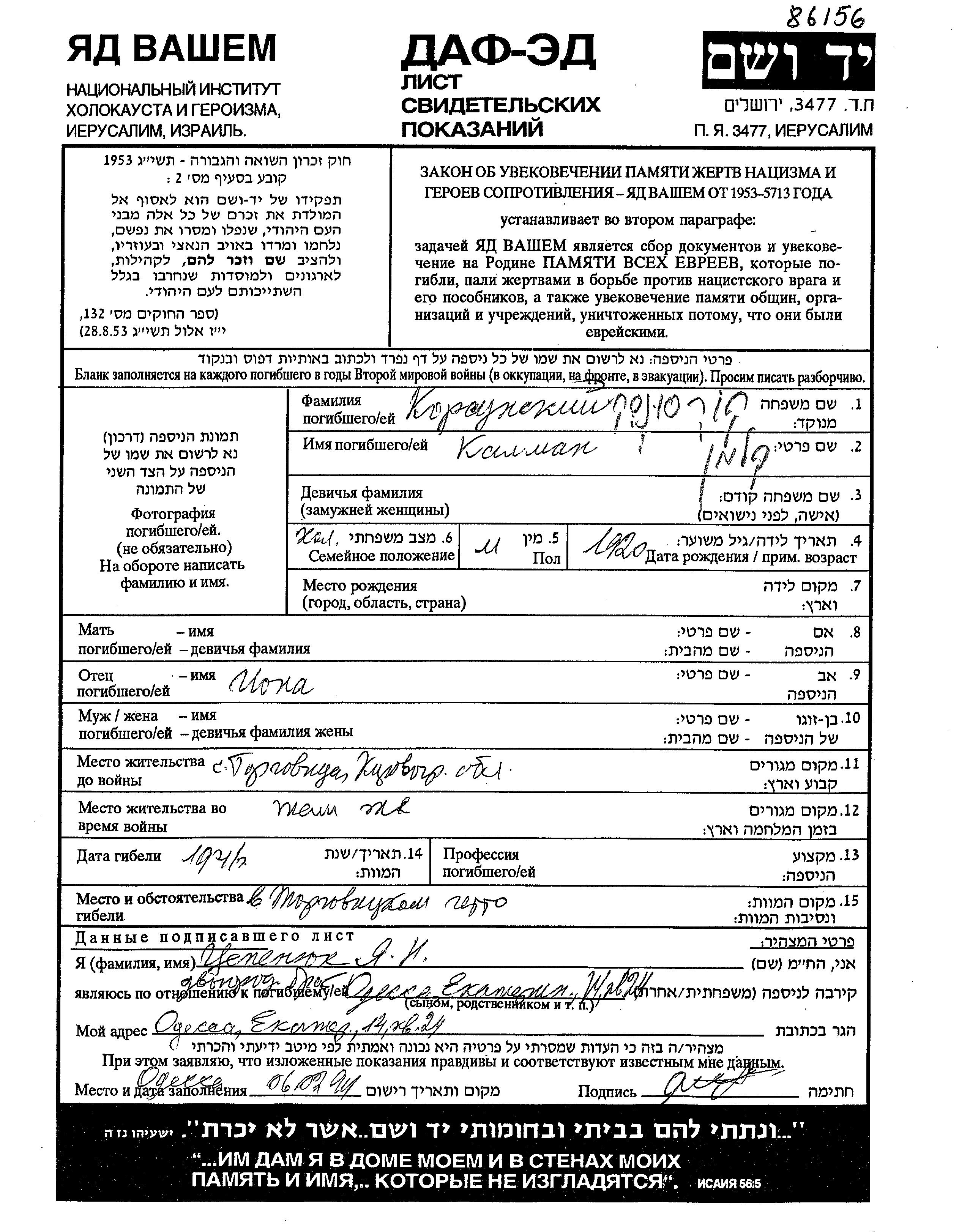 Korsunski Kalman 1920 Torgovitsa, Ukraine (USSR) Page of Testimony