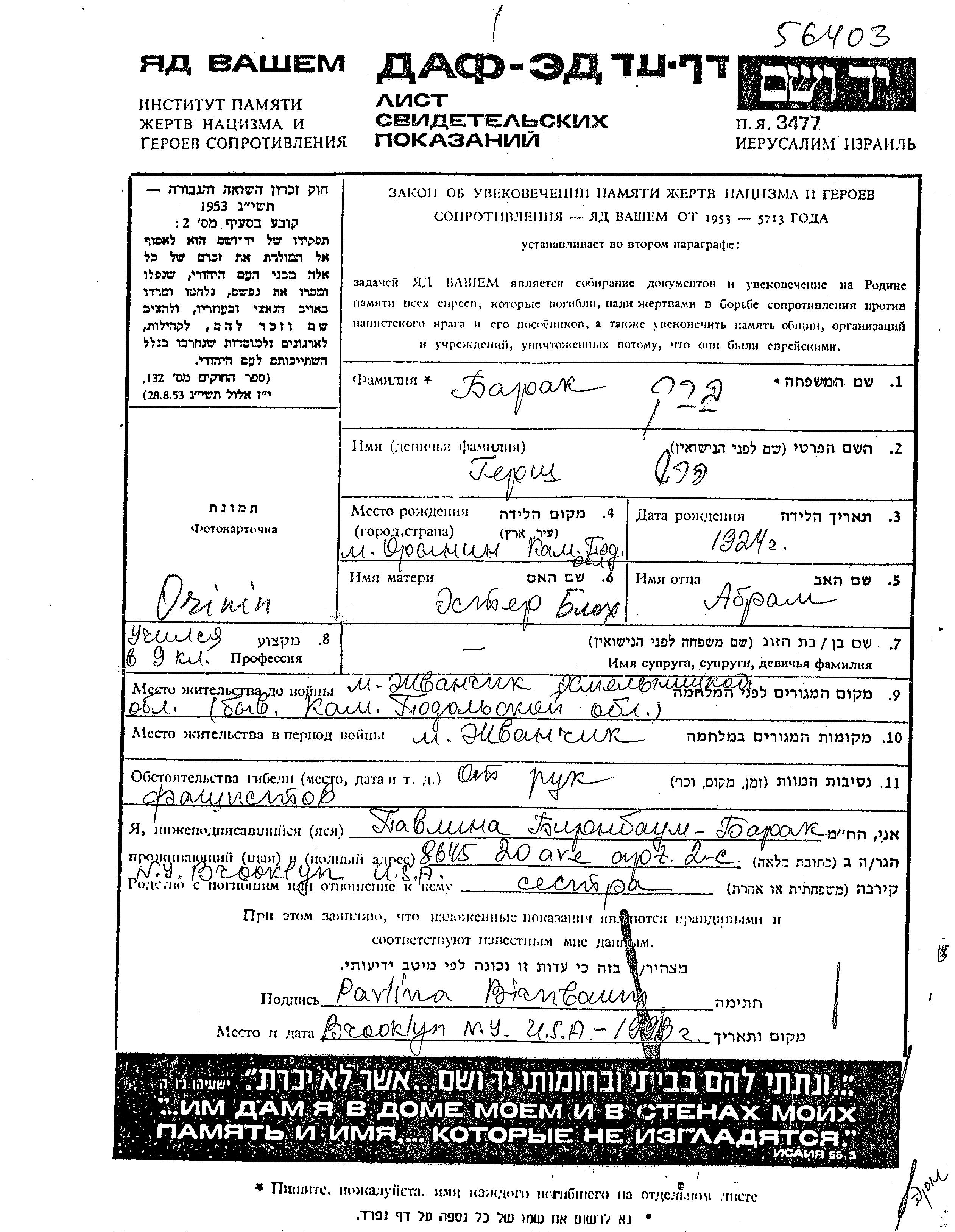 Gersh Barak Brak was born in Orinin, Ukraine (USSR), 1924. He was a pupil. Prior to WWII he lived in Zhvanchik, Ukraine (USSR). Gersh was murdered in the Shoah. Place of death: Gorodok, Ukraine (USSR), 1942.