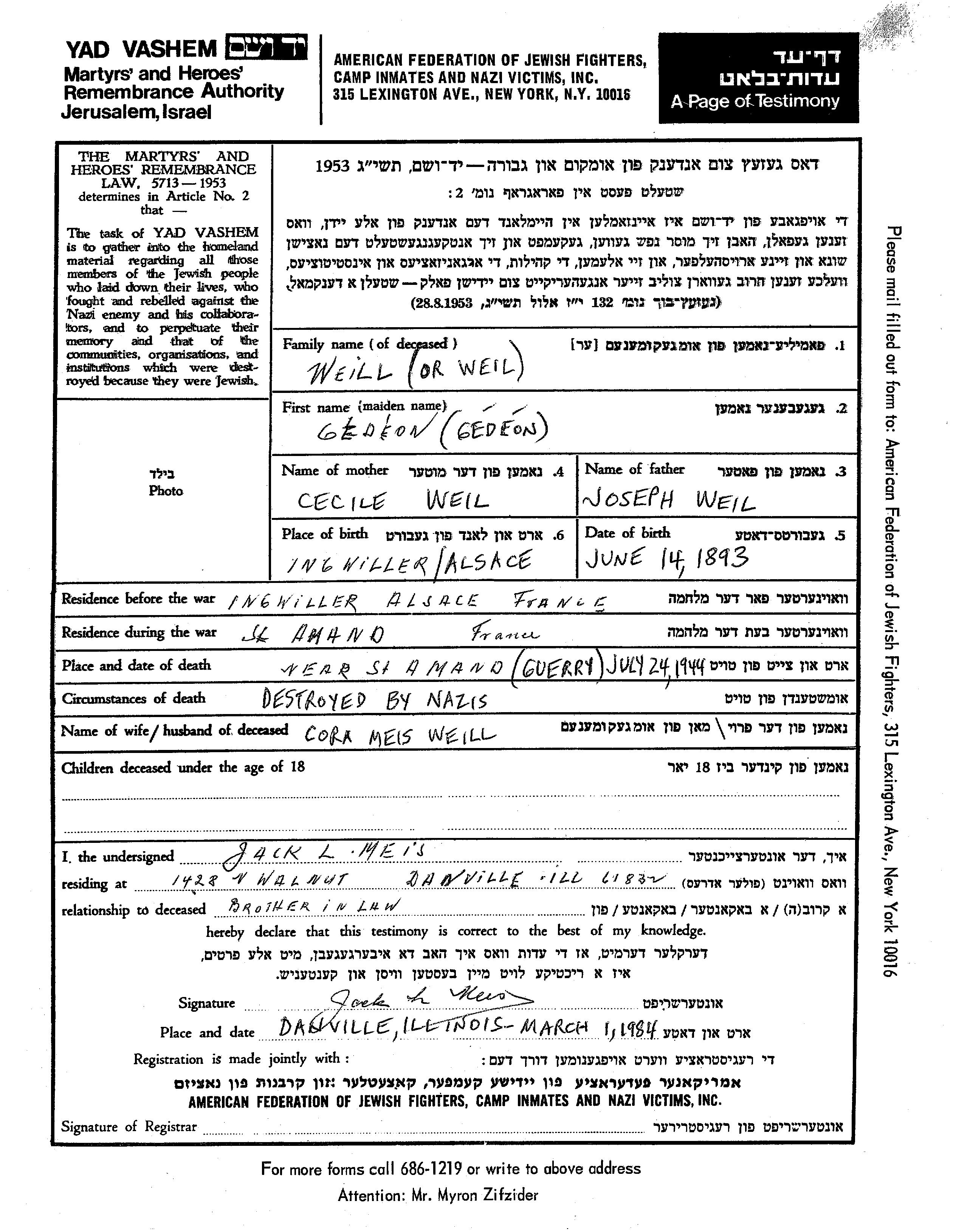 Weill Gedeon 1893 Ingwiller, France Page of Testimony