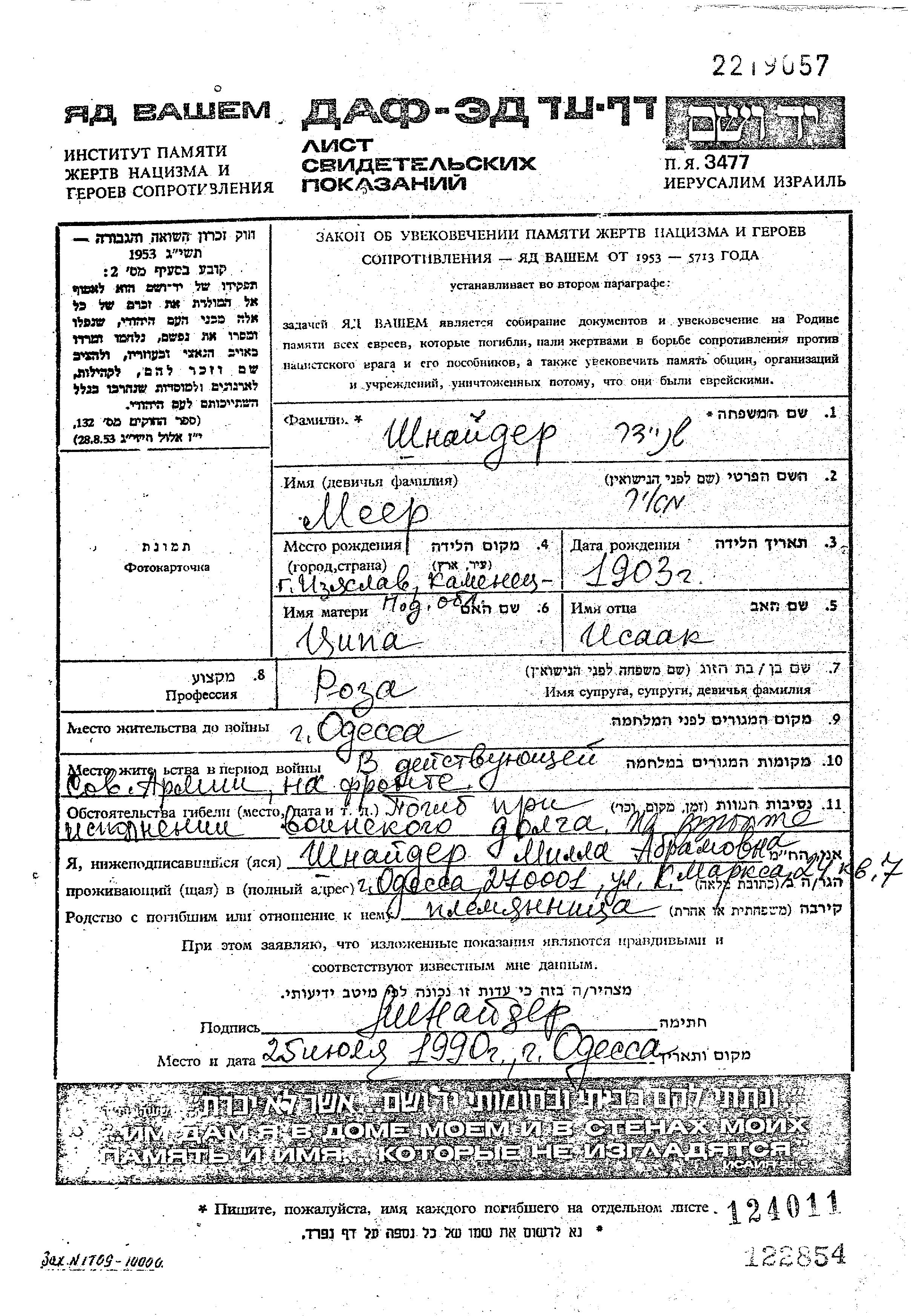 Shnaider Meyer 1903 Odessa, Ukraine (USSR) Page of Testimony