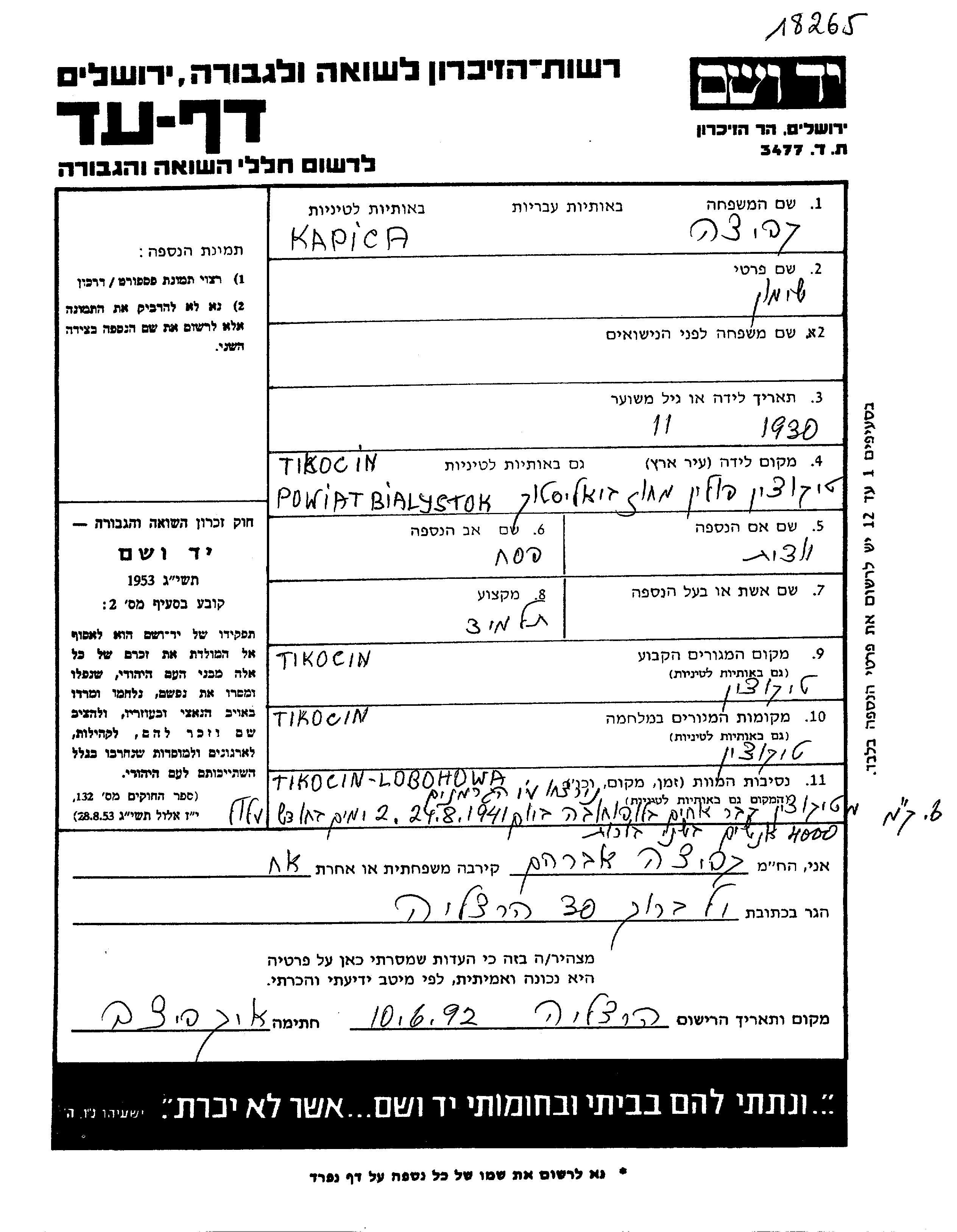 Shimon Kapica was born in Tykocin, Poland, 1930. He was a pupil. Prior to WWII he lived in Tykocin, Poland. Shimon was murdered in the Shoah. Place of death: Tykocin, Poland, 24/08/1941.