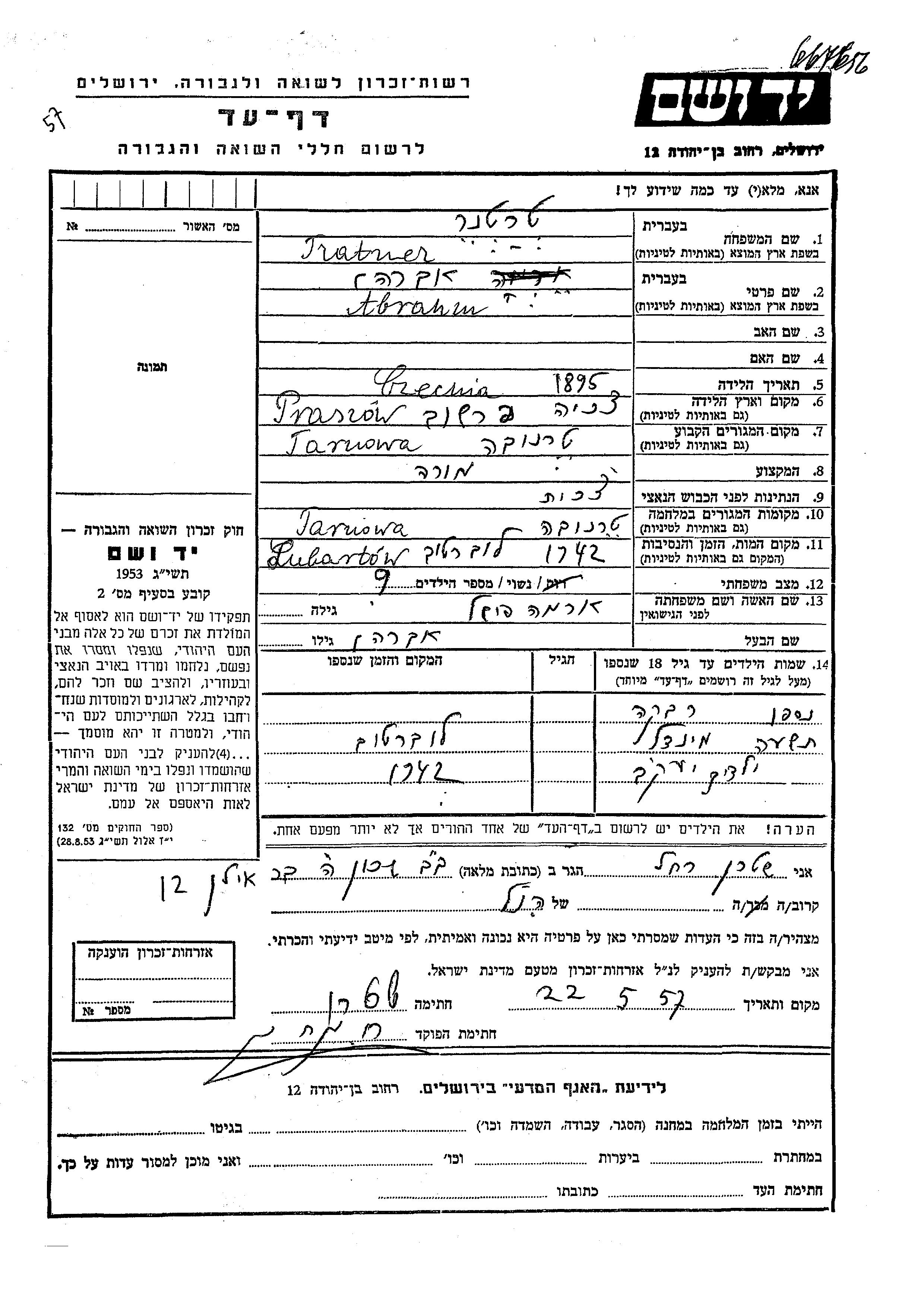 Tratner Abrahm 1895 Tarnowa, Poland Page of Testimony