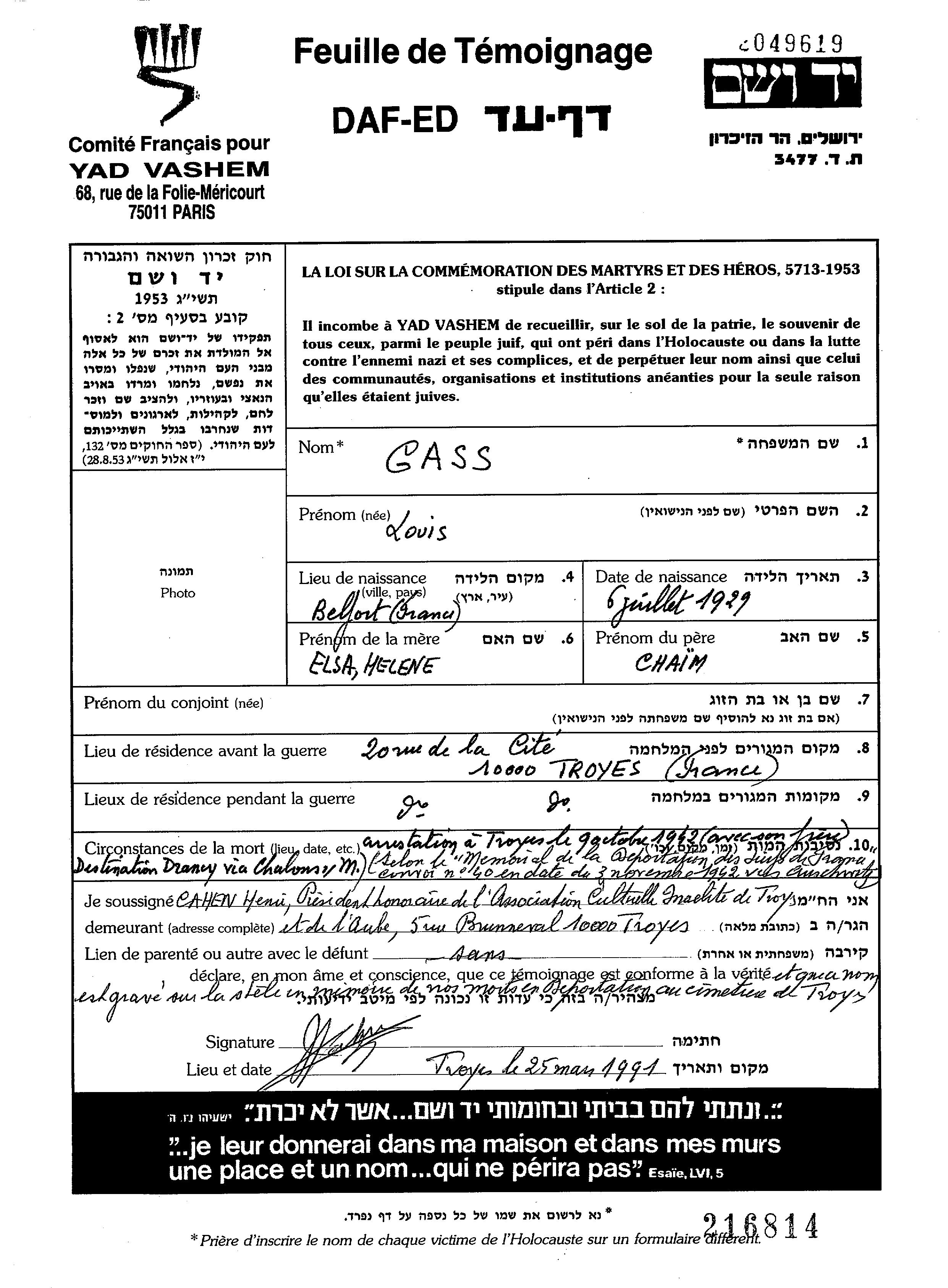 | Gass | Louis | 1929 | Troyes, France | Page of Testimony |