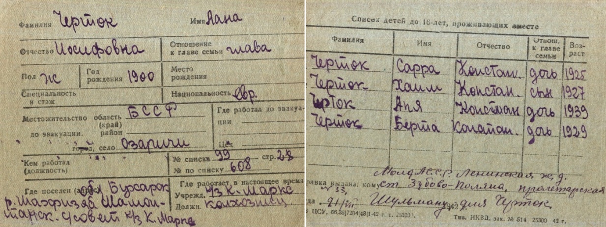 Chertok Lana 1900 Ozarichi, Belorussia (USSR) List of evacuated persons