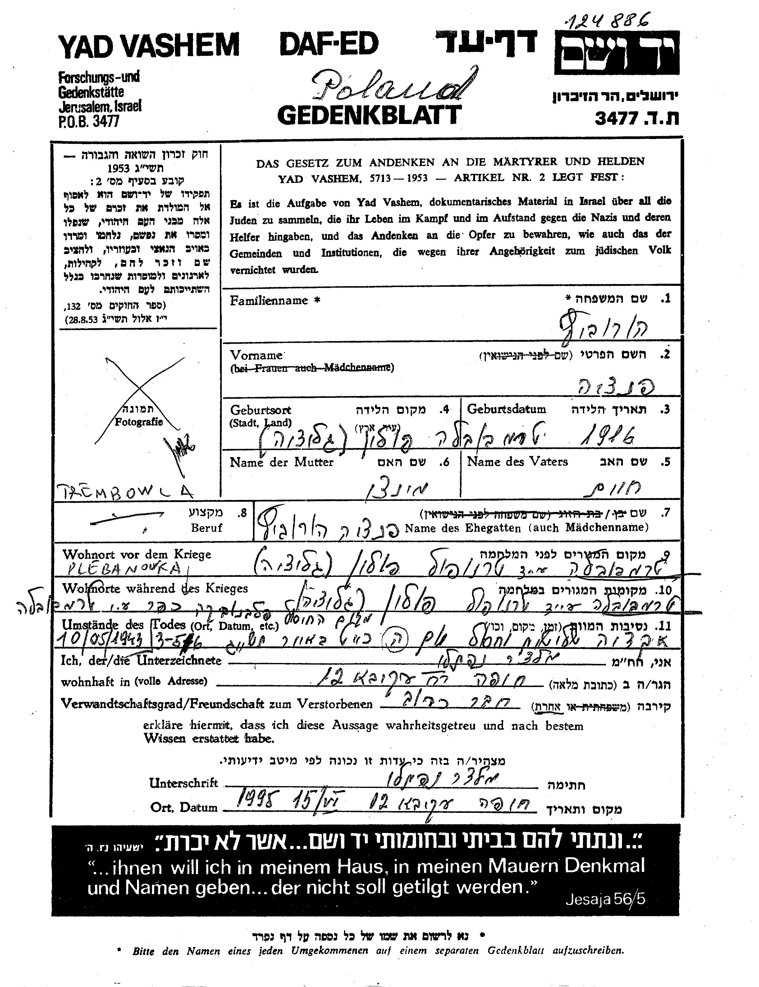 Fantzia Horovitz was born in Trembowla, Poland, 1916. Prior to WWII she lived in Trembowla, Poland. Fantzia was murdered in the Shoah. Place of death: Plebanowka, Poland, 10/05/1943.