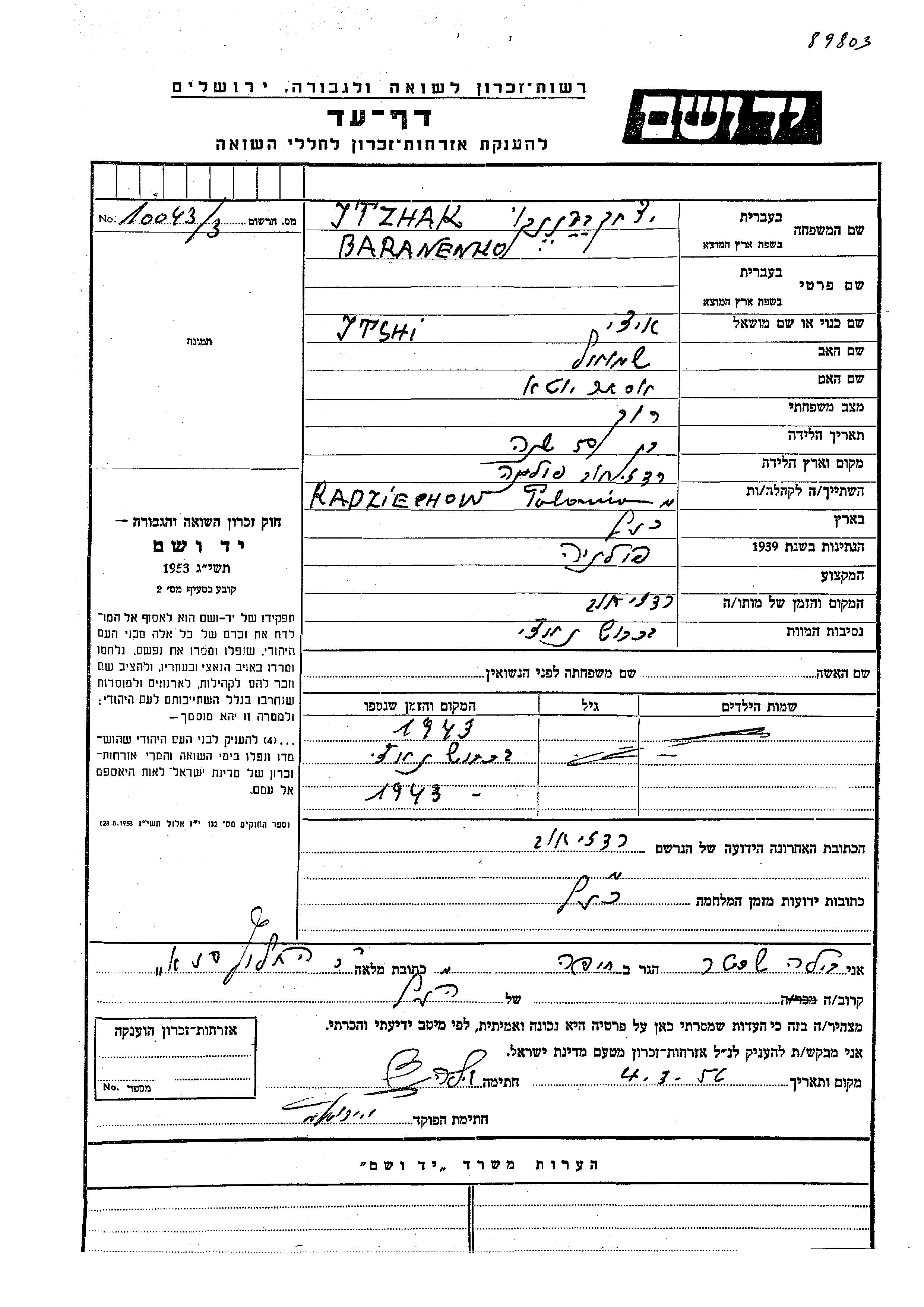 Baranenko | Itzhak | Radziechow, Poland | Page of Testimony | |