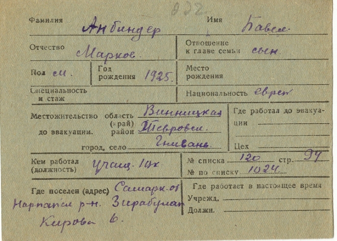 Pavel Anbinder was born in Brailov, Ukraine (USSR), 1925. He was a student. Prior to WWII he lived in Gnivan, Ukraine (USSR). Pavel was killed in military service in WWII. Place of death: Minsk, Belorussia (USSR), 1944.