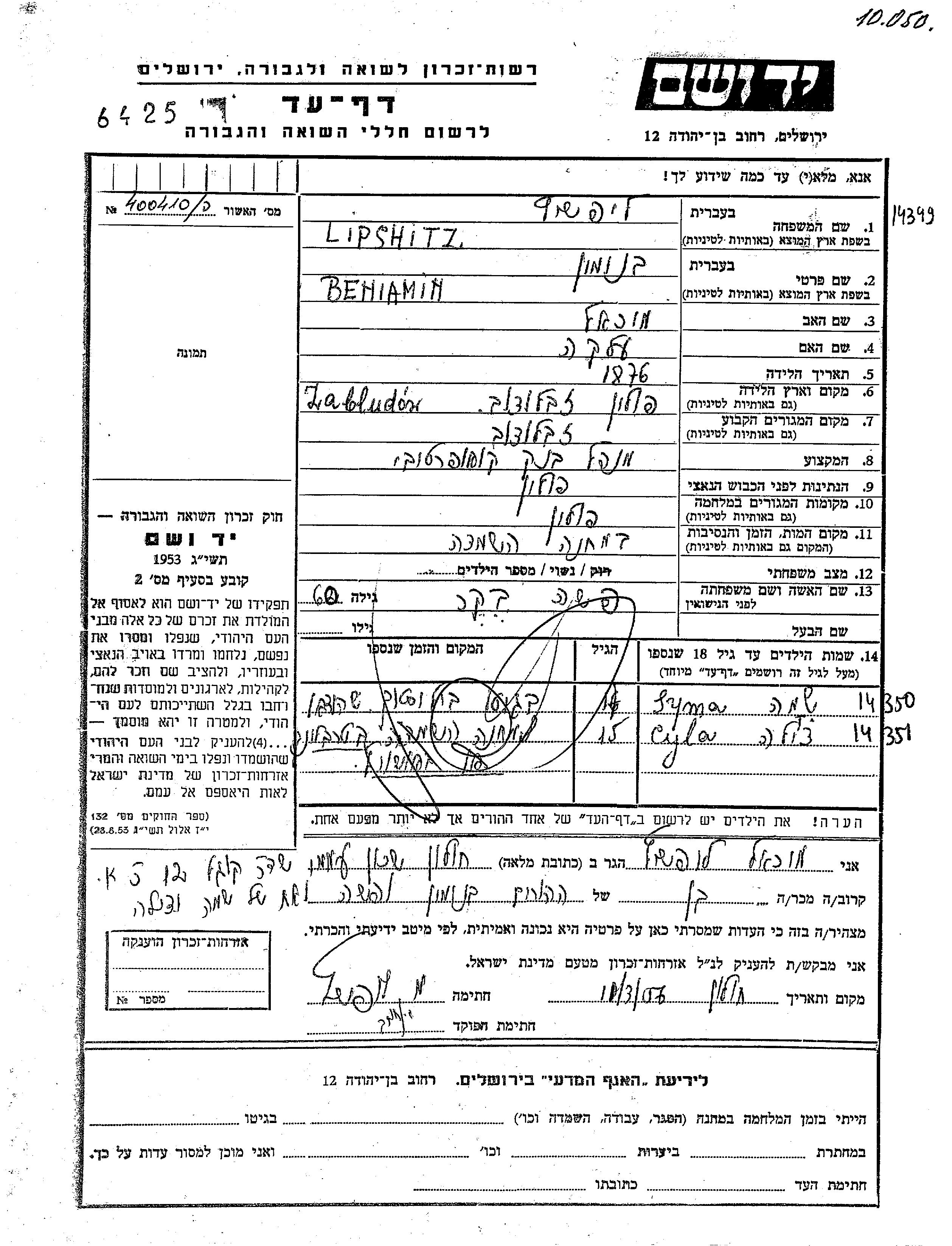 Yad Vashem - Pages of Testimony Names Memorial Collection