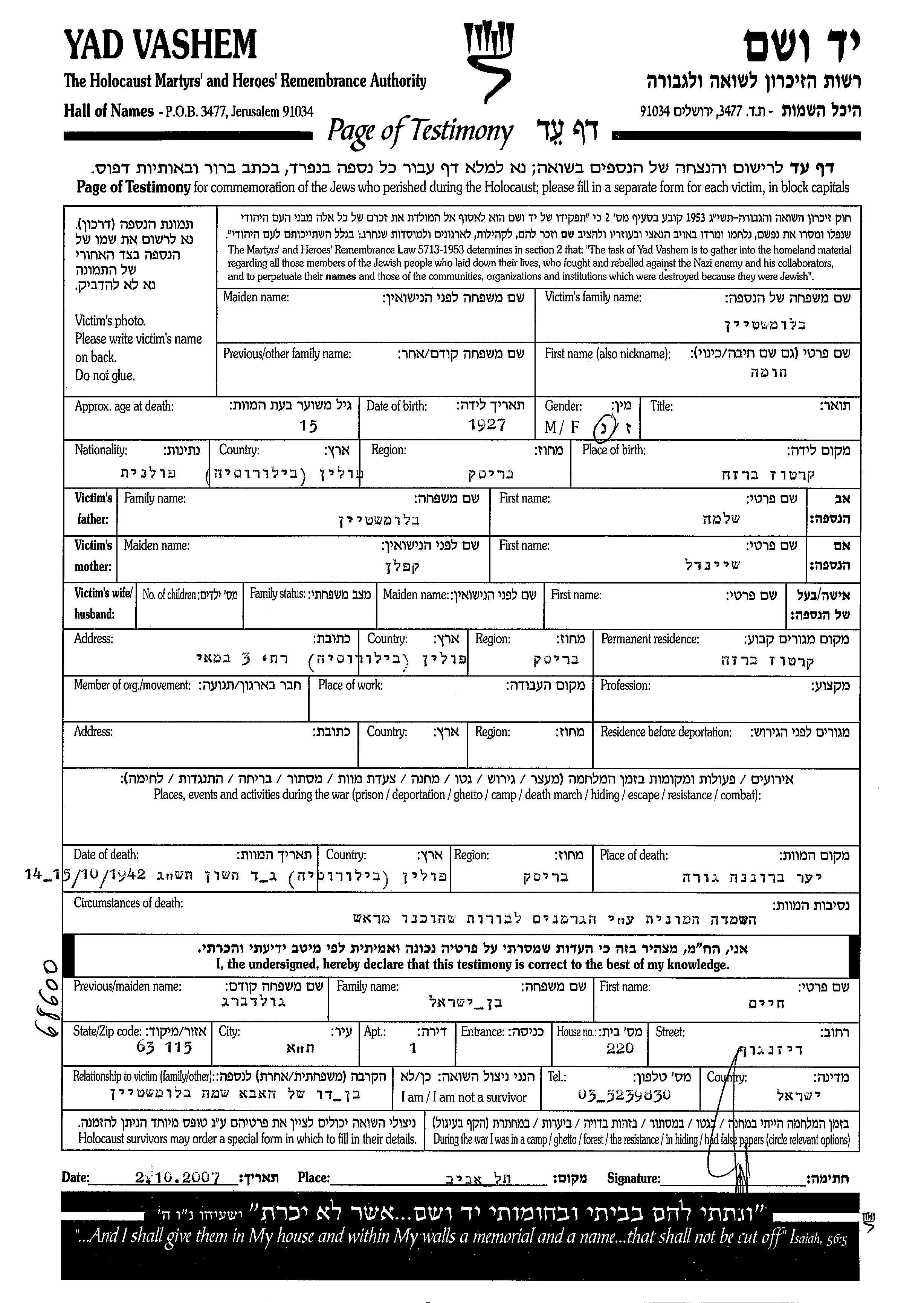 Yad Vashem - Pages of Testimony Names Memorial Collection