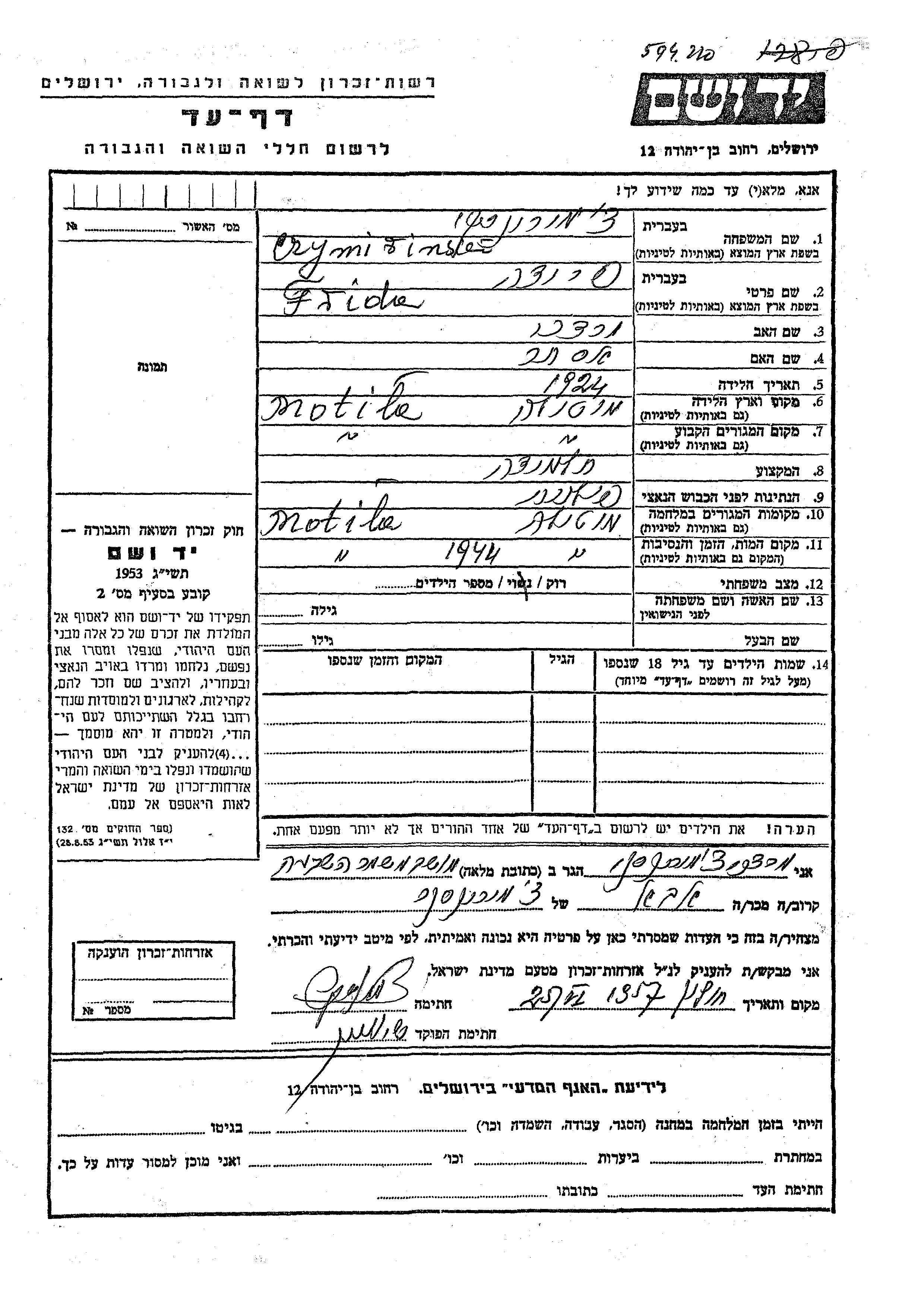 Czymirinski Frida 1924 Motila, Poland Page of Testimony