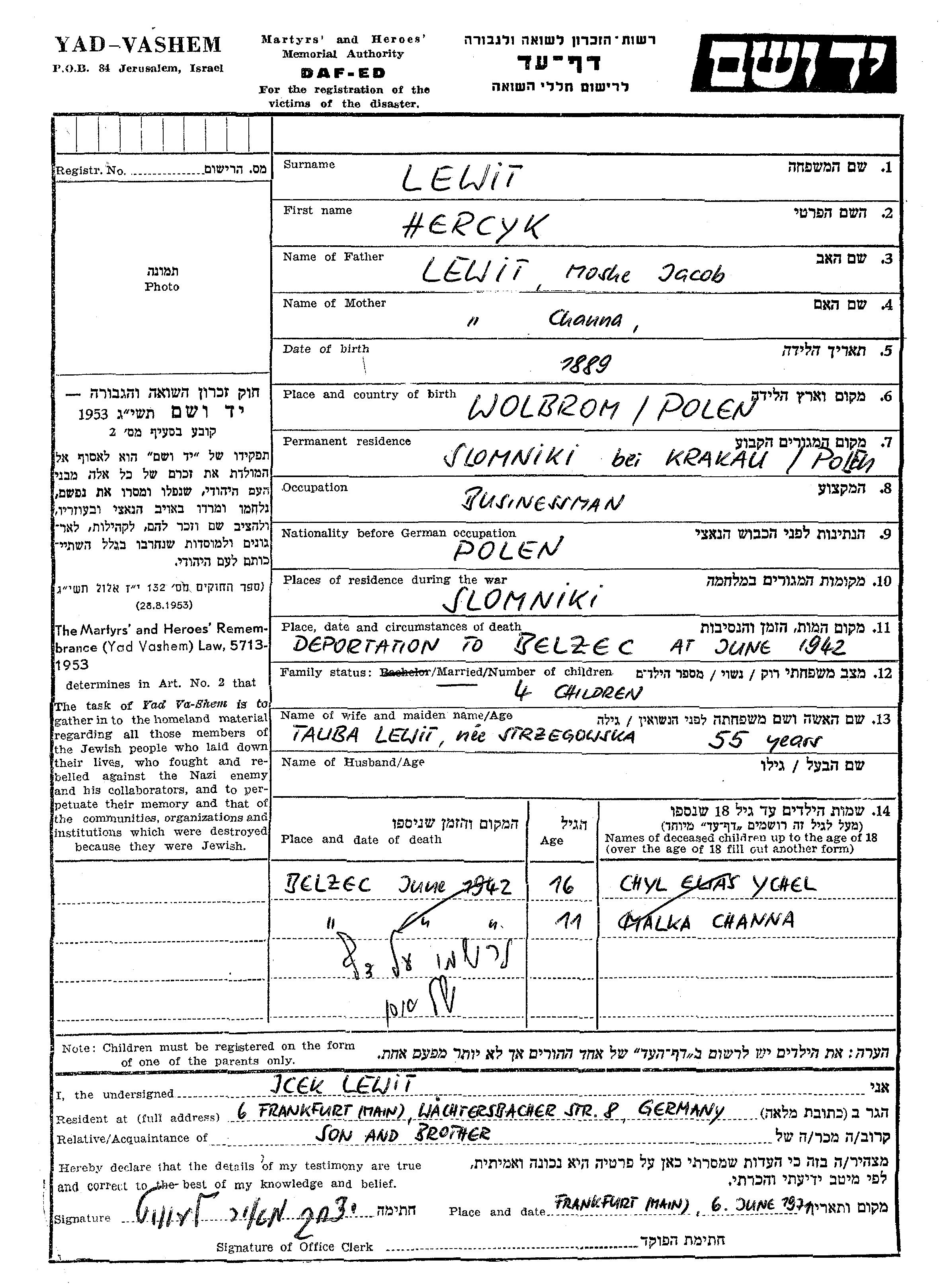 Levit Chel Elias Ychel Slomniki, Poland Page of Testimony